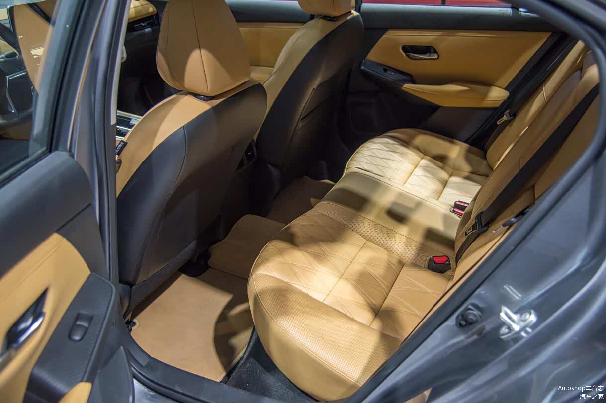 相较之下,轩逸的整体内饰用料则最为上乘。如上图所示,其双色内饰的浅色部分均采用了软性材质与缝线皮质包裹,而经过打孔处理的菱形图案真皮座椅则在视觉质感与乘坐舒适感上赢得了大满贯;乘坐空间,在前排乘客的腿部空间较为舒展的前提下(膝部距中控台手套箱约5cm,模特参考身高180cm),后排坐垫至前排靠背最短距离为26cm(实拍环境复杂难以具体量化,还望理解)。头部空间无明显硬伤。