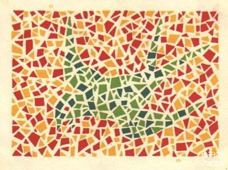 第一幅图是一只“鸟”。正常的识别仍然很简单,但是鸟的背景颜色是绿色的,所以它被用来测试绿色色盲。如果你认不出那只鸟,那么你可以肯定你是色盲。当然,无论是绿色盲还是全色盲都不能识别这幅图。虽然这张照片很简单,但是如果你认不出来,你就很难拿到驾照。