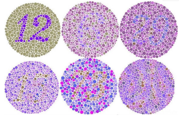 第四幅图是最难的。主要用于色盲和色弱的检测。可以看到这幅画里有六幅小画。它们是数字“12、6、29、15、73、5”。前五幅小画很容易辨认,最后一幅在远处也能辨认出来。无法分辨数字“12”是全色盲,无法分数字6和29是紫色弱,无法分数字15和73是红色弱,无法分数字5是灰色弱。
