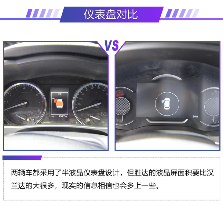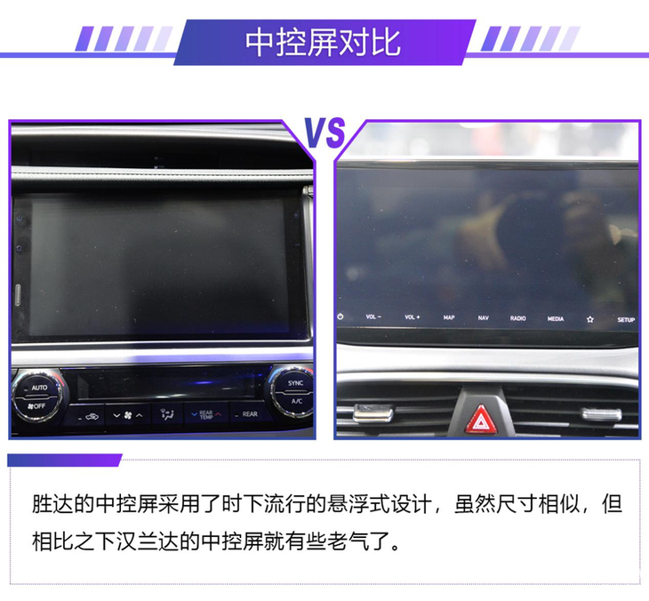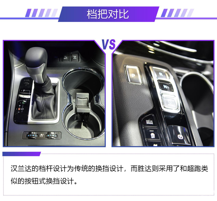 内饰方面,这两辆车都采用了大量皮质包裹,在豪华性方面毋庸置疑。但整体来看胜达的科技感和运动感要强一些。平底方向盘、悬浮式中控屏都是加分项,而汉兰达则中规中矩,但该有的都有只是在时尚感方面略逊一筹。