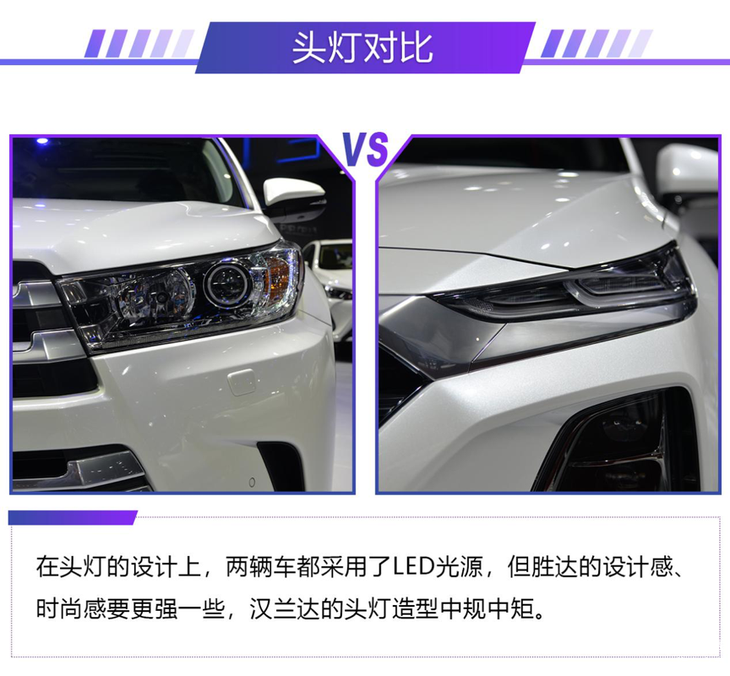 外观方面,胜达的造型要更加运动,同时也更加时尚,而汉兰达的外观设计感就没有胜达那样年轻化。相反,汉兰达的外观要更加硬派一些,也更加符合汉兰达的定位。