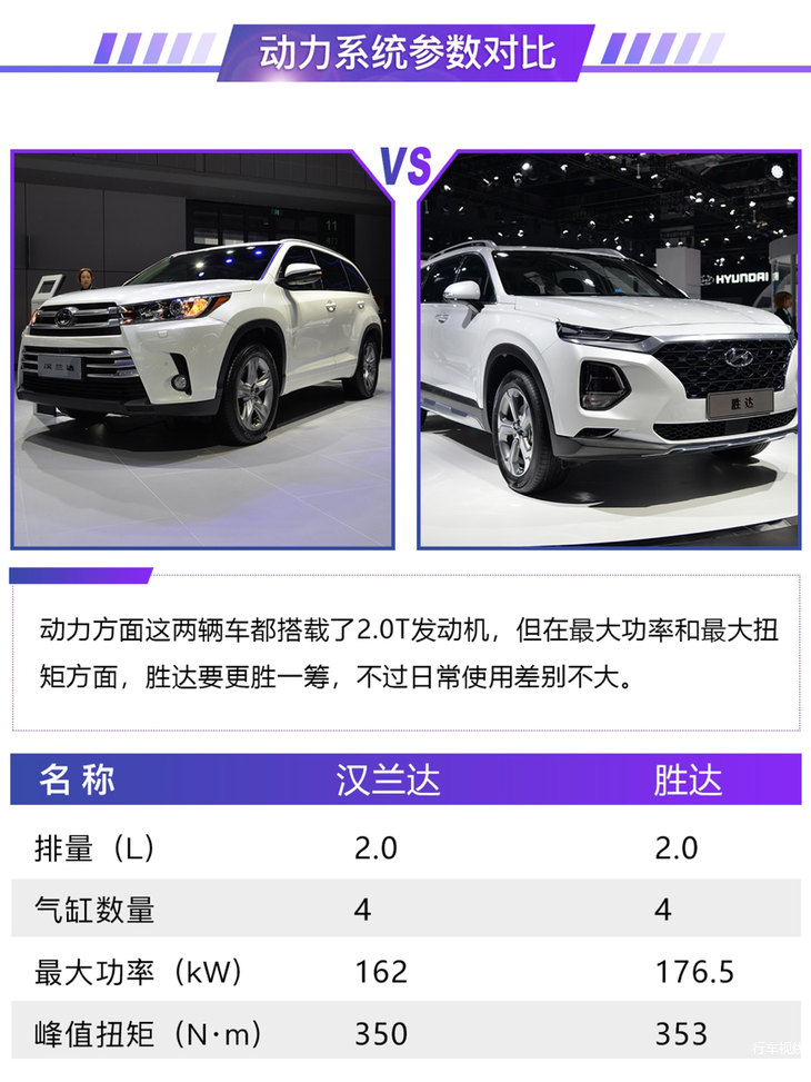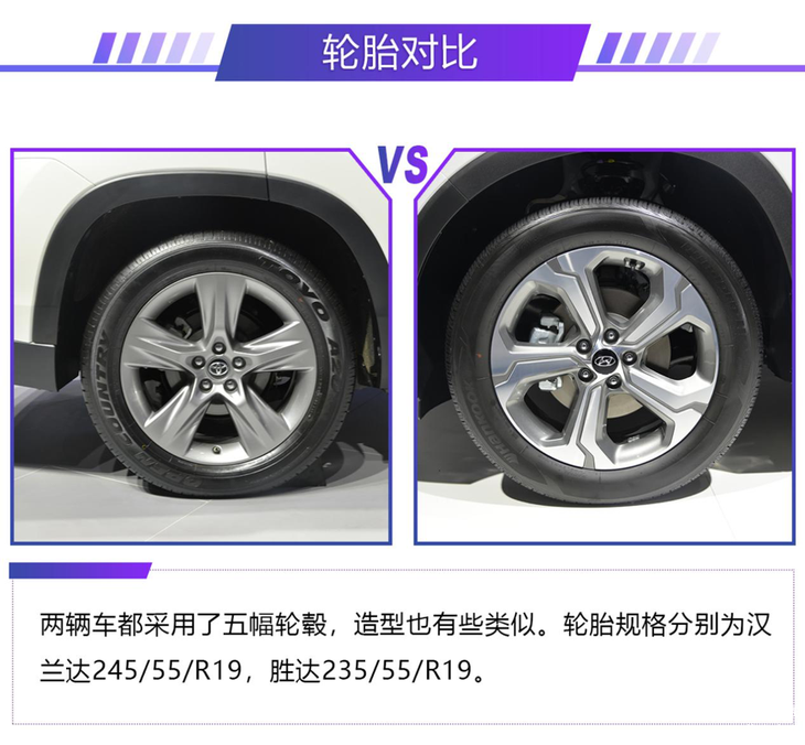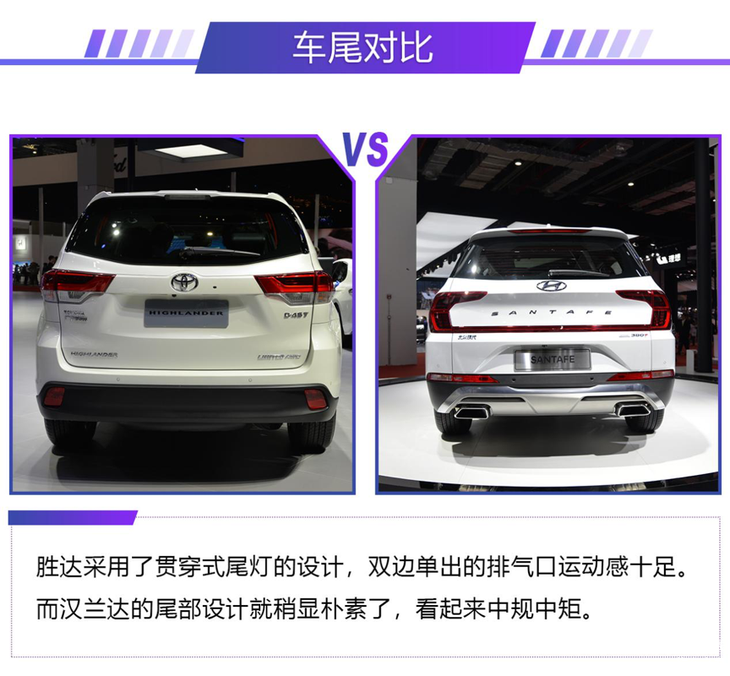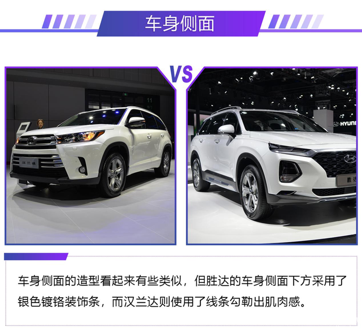 汉兰达作为目前中型SUV中的标杆,不少刚上市的中型SUV都会将其作为竞争对手,北京现代刚上市的全新胜达就是其中之一。本届车展上,行车视线针对两款车型进行了一次对比,看看全新胜达能否成为汉兰达最直接的竞争对手。