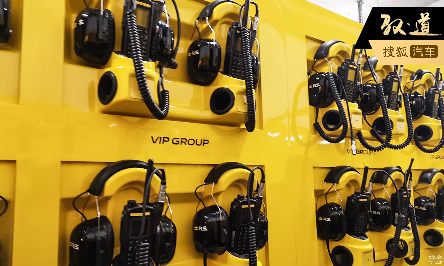 由于比赛还没有开始,车队技师们和工作人员所佩戴的无线电通讯设备整齐码放。