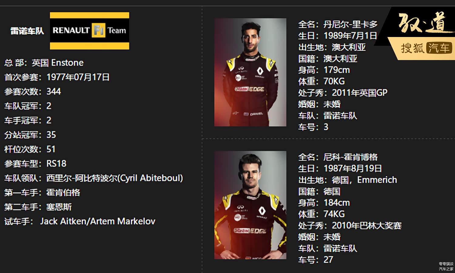 今年雷诺F1车队迎来了澳大利亚车手丹尼尔·里卡多。自2014赛季被提拔为正式车手后,丹尼尔·里卡多在4个半赛季的时间里获得了7个分站赛冠军,29次登上领奖台,2次杆位以及904个积分;在2018 F1最佳车手评选中位居前5位;他与尼科·霍肯伯格的联合能够形成互补给团队带来强大的竞争力。