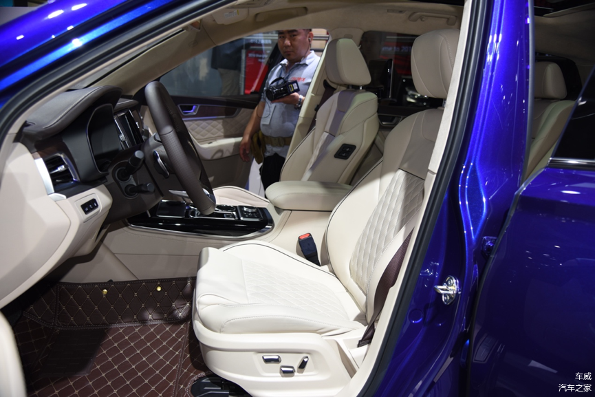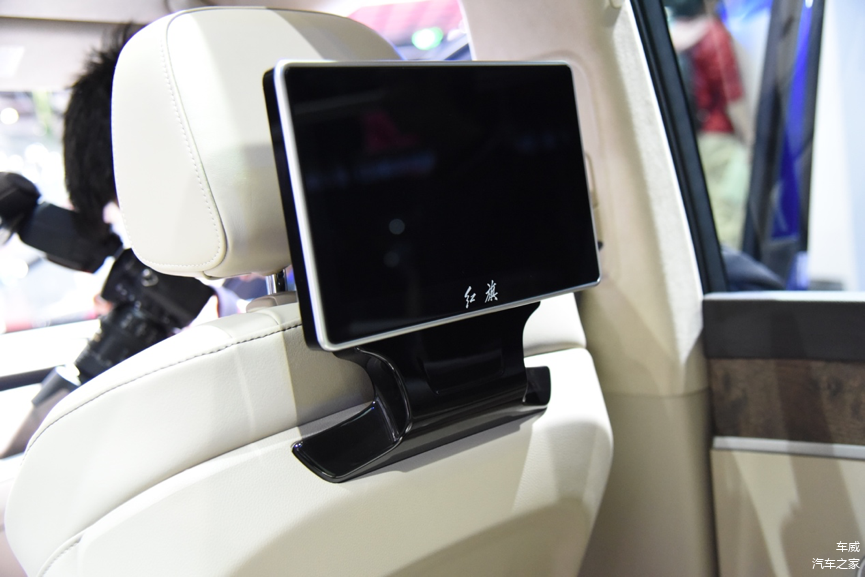 红旗HS7提供5座和7座两种布局,但是由于现场仅展出5座车型且未通电,所以无法体验到第三排及后备箱空间(电动后备箱无法开启)。红旗HS7的座椅采用纯白颜色的真皮包裹,细节处还经过了打孔和棱形缝线等处理,看起来很有豪华感。包裹座椅的真皮材质触感十分出色,座椅填充物较为柔软,但是乘坐在上面并没有深陷沙发的舒适感,深层的填充物能够给予坚实的支撑。