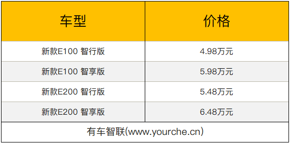 两款车型在外观、配置上与现款车型均为做出变化,主要针对续航进行升级。E100车型200km续航版本已停产,250km续航版本智行版售价增加3000远,智享版售价未做出调整。E200车型250km续航版本售价均增加5000元。