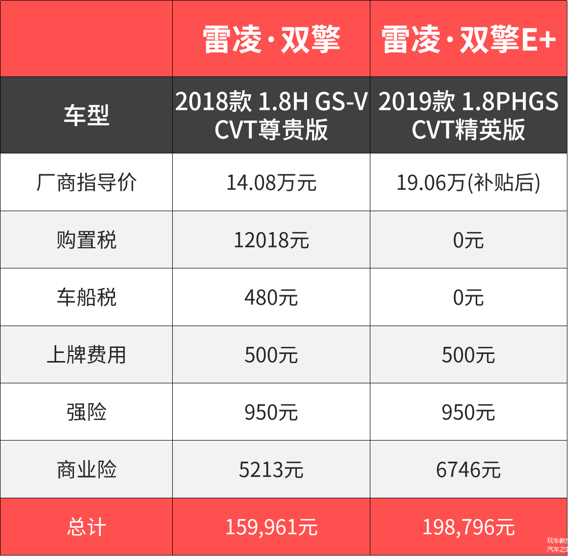 前期落地费用约为16万和19.9万。雷凌·E+因为免购置税和补贴,所以落地价等于裸车价+保险。这里的差价是3.9万。