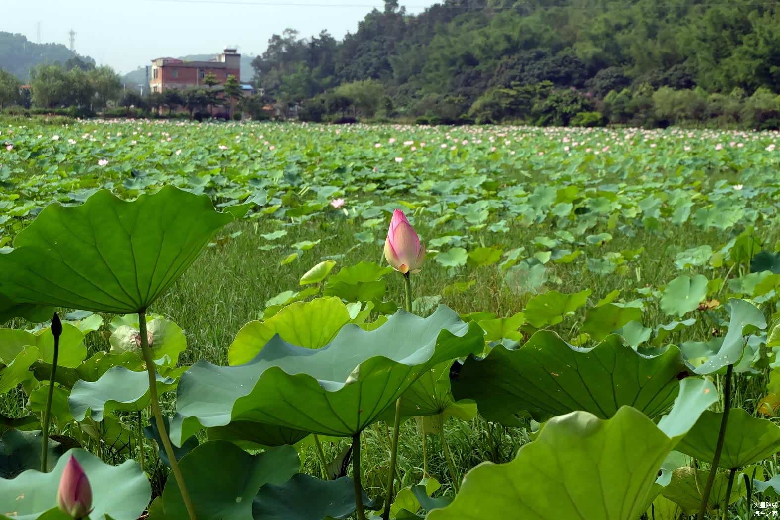 通过一条弯曲小路进入到 莲塘村 ,村口是一大片莲塘。