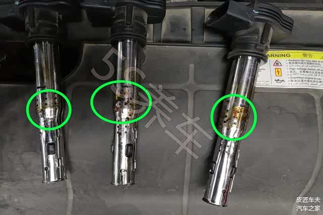 下图这是拆卸下来的点火线圈,点火线圈金属外壳上粘附的机油痕迹,可以再一次充分证明气门室盖垫的确在漏油的事实,修车师傅介绍,现在气门室垫漏油的问题还不算太严重,本次维修可以暂时不用更换。