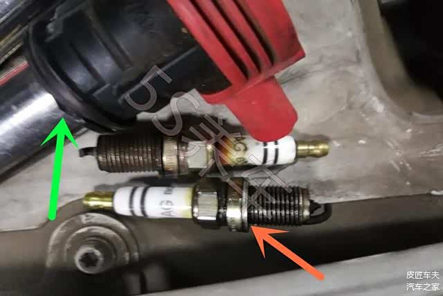 修车师傅介绍到,所谓的汽缸不发火就是指,发动机某汽缸不工作或者工作不好,通俗点来说就是发动机缺缸,而导致发动机出现缺缸的原因,一般不是点火线圈的事就是火花塞的事,为了确准它们两个到底是谁坏了,修车师傅将3缸的火花塞与1缸的火花塞进行了对调,如下图所示,绿色箭头所指的就是点火线圈,橙色箭头所指的就是火花塞。