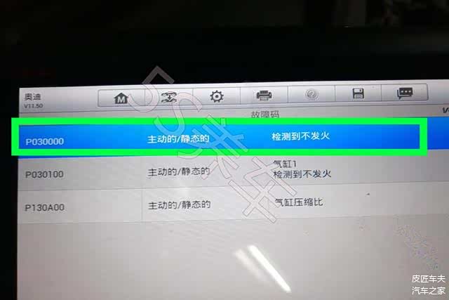 修车师傅将火花塞对调后,启动着发动机抖动故障问题依旧存在,但是用诊断仪诊断出来的故障码发生了改变,如下图诊断仪检测出来的结果,由原先的汽缸3检测不到发火,变成了现在的汽缸1检测不到发火,这就证明原先3缸上的火花塞是有问题的。
