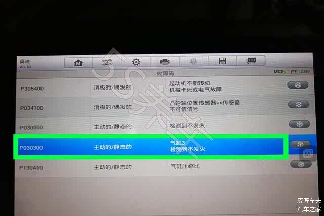 修车师傅为了快速确准故障问题的根源,使用诊断仪对行车电脑进行了故障诊断,如下图所示;在行车电脑中一共诊断出来5个故障码,修车师傅介绍,其他4个故障码暂时不用管,绿色区域标注的汽缸3检测到不发火故障才是最主要的。