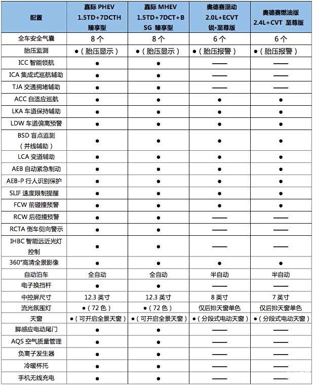 当然,家用MPV的配置是很多人都最为关心的,尤其是对于的家庭来说,一辆配置优越的车可以让全家享受到安全、舒适的旅程。所以,我们来看一下嘉际PHEV与老牌合资车型奥德赛混动的对比表,嘉际的L2级智能驾驶技术、全自动泊车系统、冷暖托杯、脚感应尾门等也是奥德赛所不具备的。
