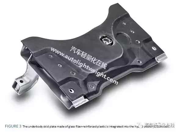 由于车身底板已经由FRP制成,如图3所示,因此可以避免地板下保护的额外成本,并且不需要额外的组装工序。此外,集成的塑料下壳还增强了空气动力学特性,因为可以容易地实现空气偏转结构和扰流板。在冲击挤压过程中,可以直接在FRP材料中形成用于电缆或较小附加部件的紧固元件。