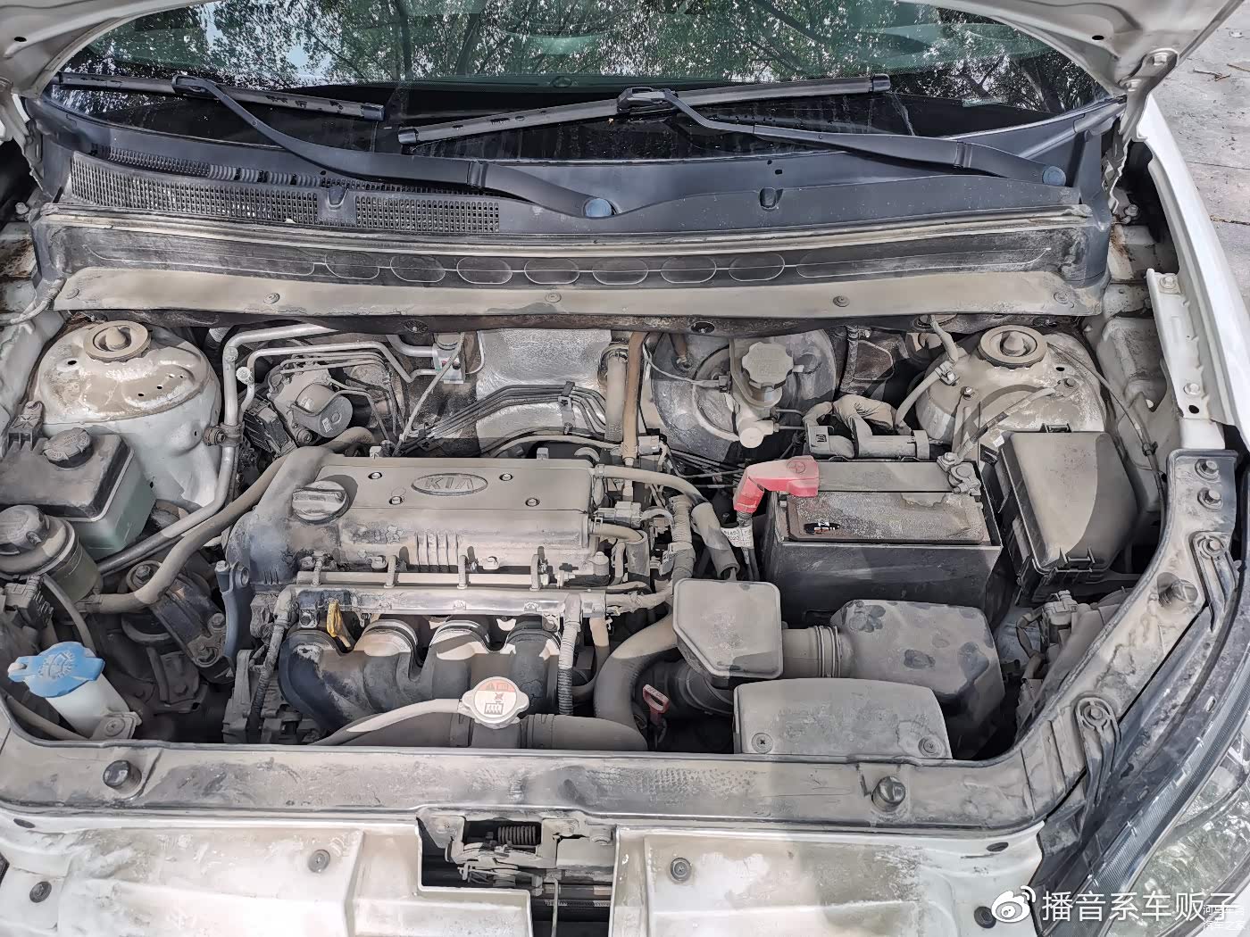 打开发动机舱,起亚老旧的G4FC发动机唯一的优点就是不烧也不漏油,故障率极低,要想把它开坏可不件容易的事情