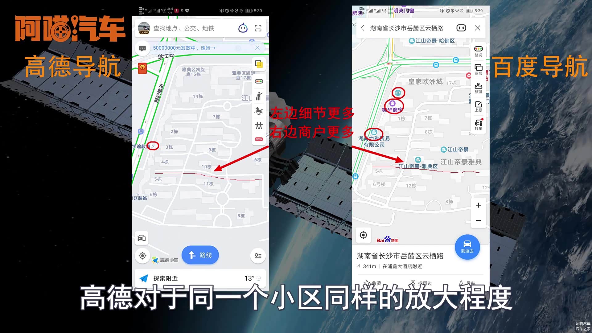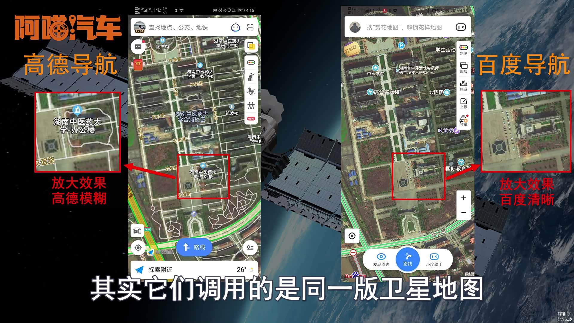 我们再来看一下卫星地图,同样是找了一个学校校区的卫星地图对比来看,其实他们调用的是同一版卫星地图,但是高德把地图做的比较模糊,基本上看不到停车场的车,而百度的地图放大之后可以数清楚停车场上有几台车而且建筑物的轮廓明显,这点补充可以在关键时候帮上我们大忙。
