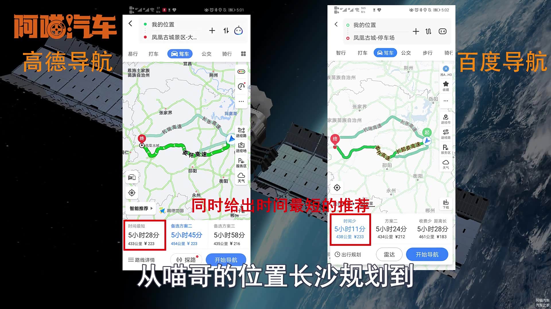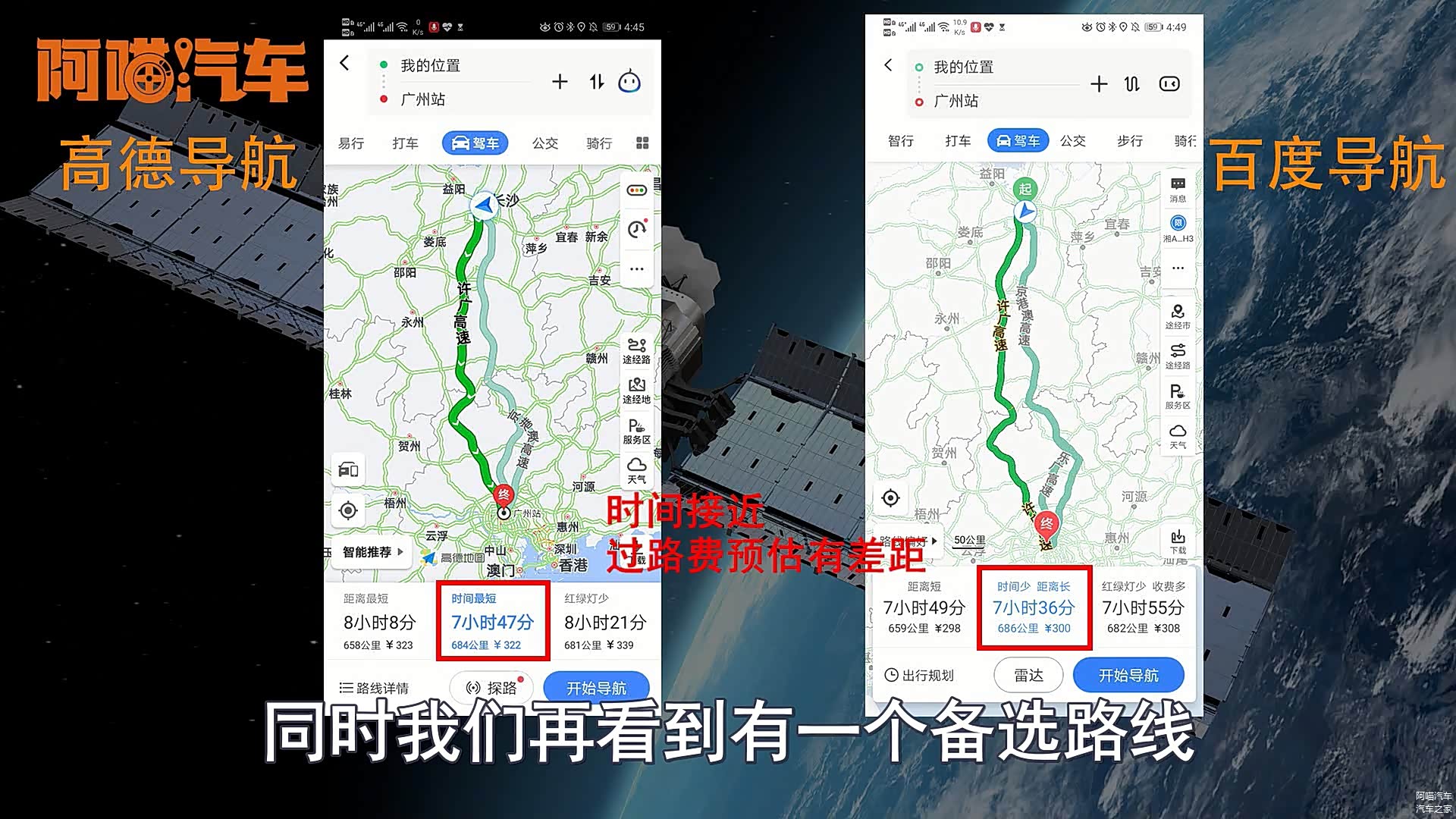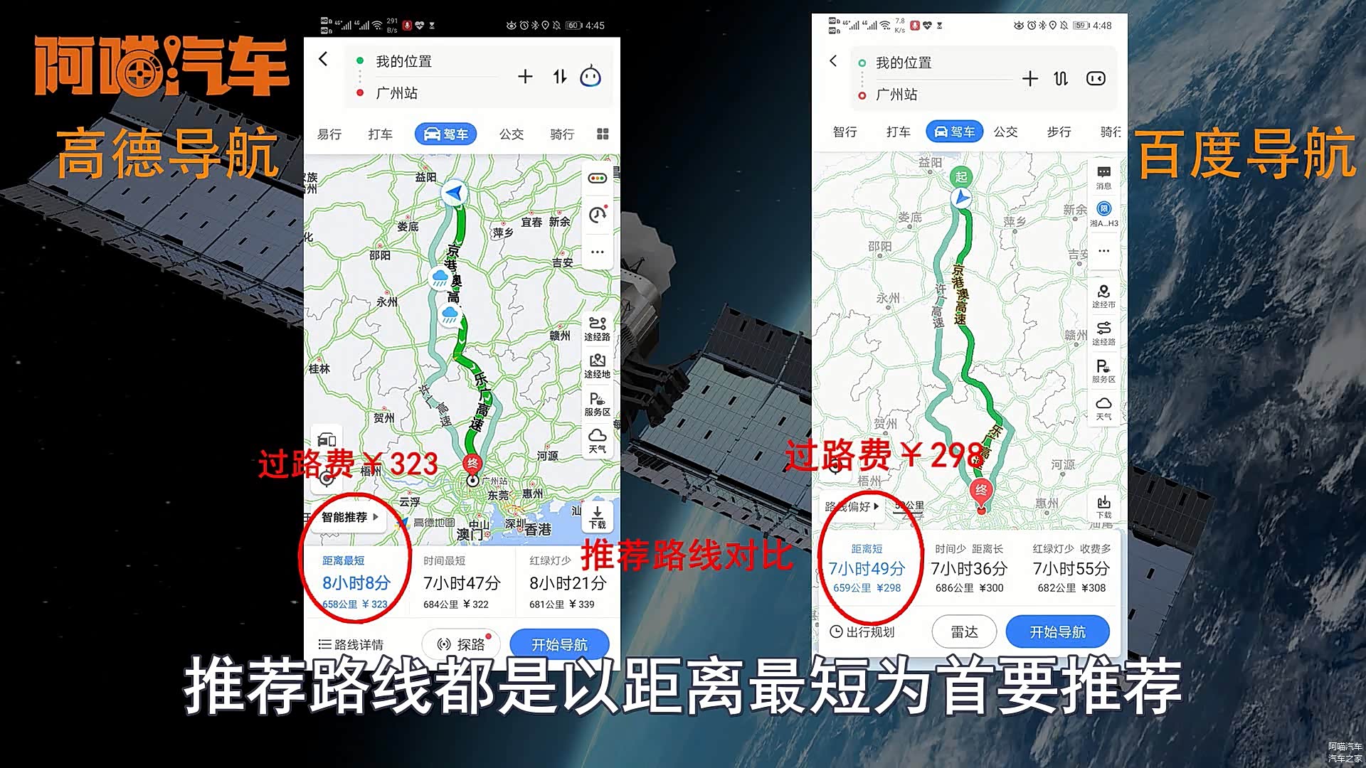 大家好我是喵哥,现在外出开车不可避免的都会使用导航,而比较主流的无非就是高德和百度,所以今天喵哥就跟大家对比一下百度和高德这两款导航它们之间的优势和劣势,首先喵哥以广州火车站为终点,然后两个地图同时规划路线,推荐路线都是以距离最短为首页推荐,高德推荐的是走京港澳高速,然后走乐广百度也是一样,时间高德八个多小时多一点百度不足八个小时,但是路费这个地方高德是323块钱,而百度只有298块钱,根据喵哥平时开这条路的经验高德的过路费计算应该会更准确一点。