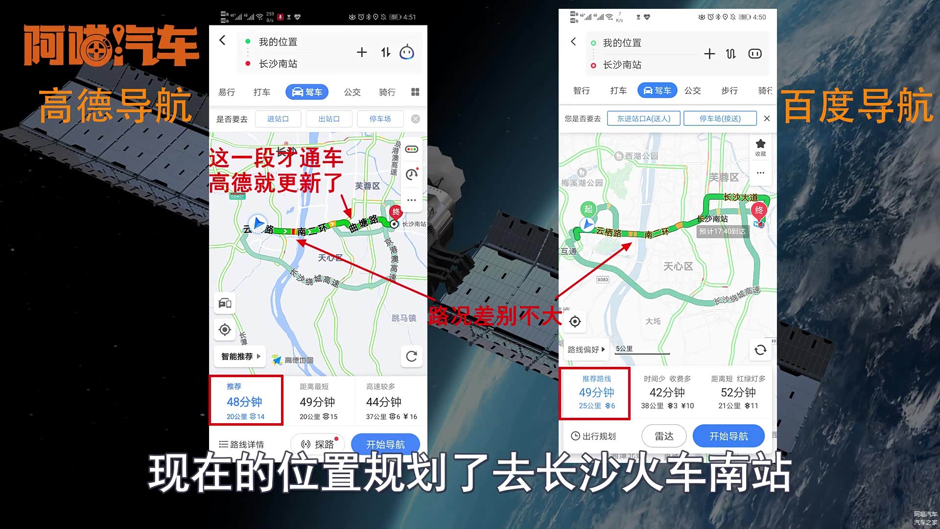 再来看一下市里面,从喵哥现在的位置规划去长沙火车南站也就是高铁站的路线,高德这个地方居然推荐了一条刚刚修通的一条捷径,只有20公里,这条路线据喵哥所知修通的时间很短,从这点来看在地图的更新速度上高德可能确实会做的更快一点,同时在路况上对于路况的把握和预测基本上是一致的,但是高德在过桥前显示的是红色,而百度显示黄色,据喵哥平时上下班经过这地方的经验来看红色可能会更靠谱一点。