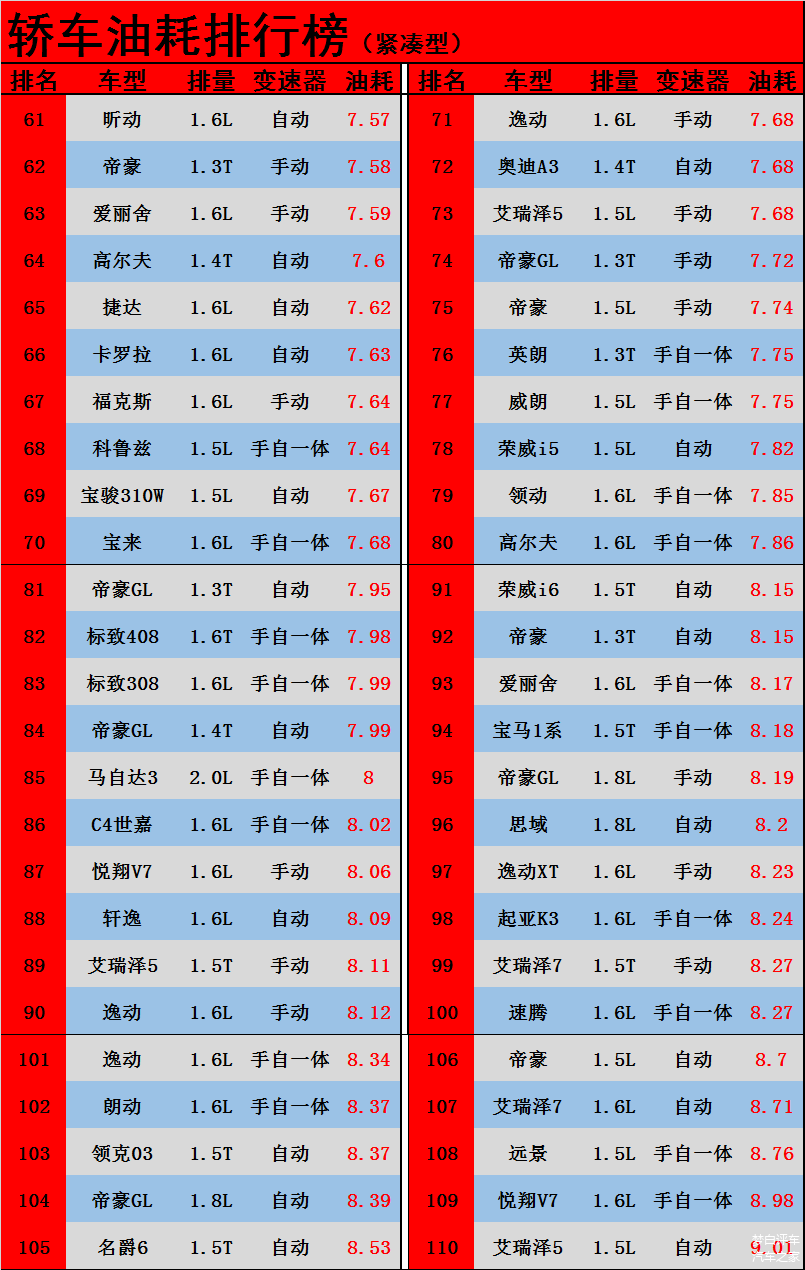 4、家用轿车油耗排行榜61-110:
