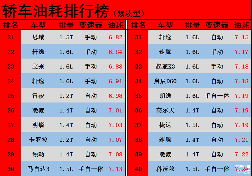 2、家用轿车油耗排行榜21-40: