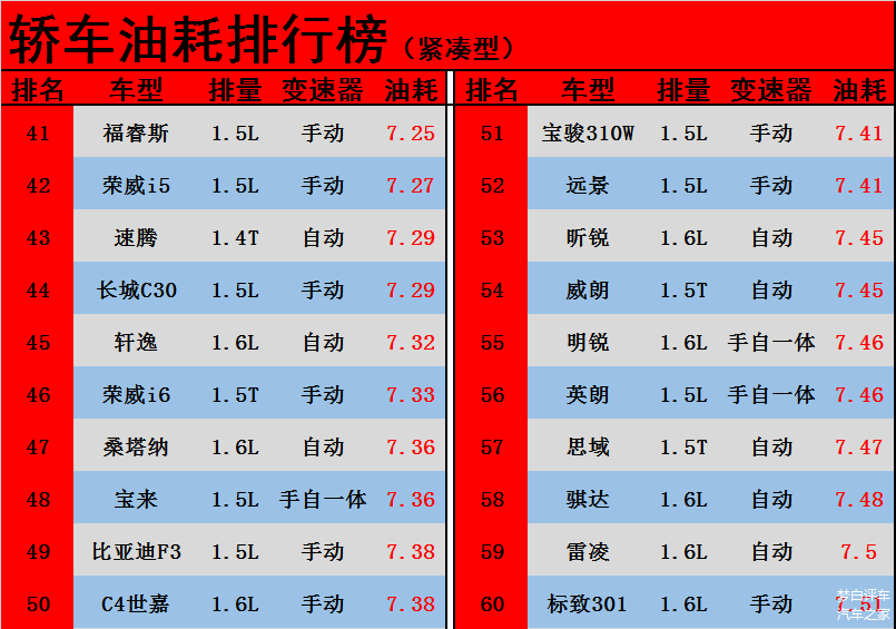 3、家用轿车油耗排行榜41-60: