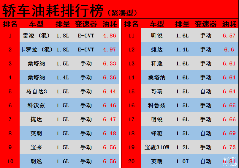 1、家用轿车油耗排行榜1-20: