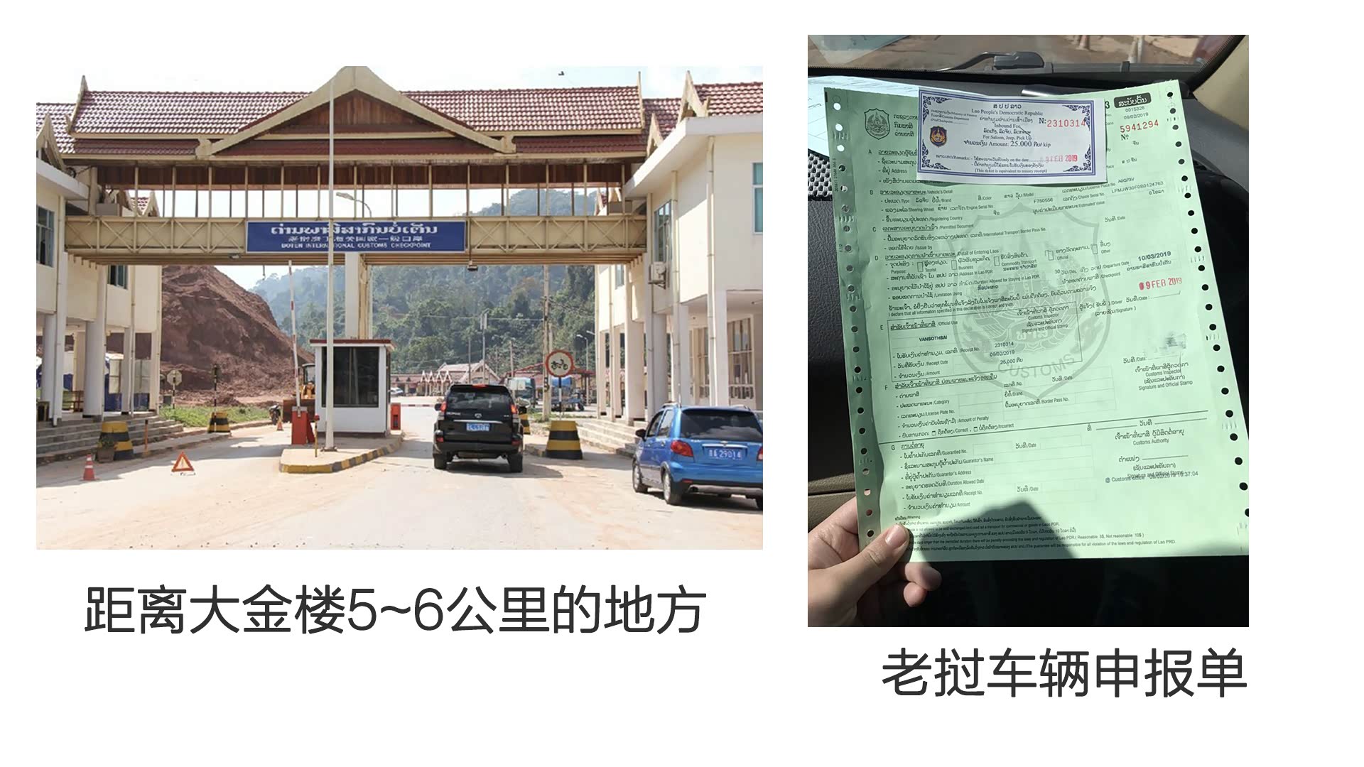 D:进入老挝口岸大金楼,停下车辆,人员走过去在右边进去后,办理护照落地签(提前办理护照签证的朋友过去盖章)驾驶员需要办理临时驾驶证
