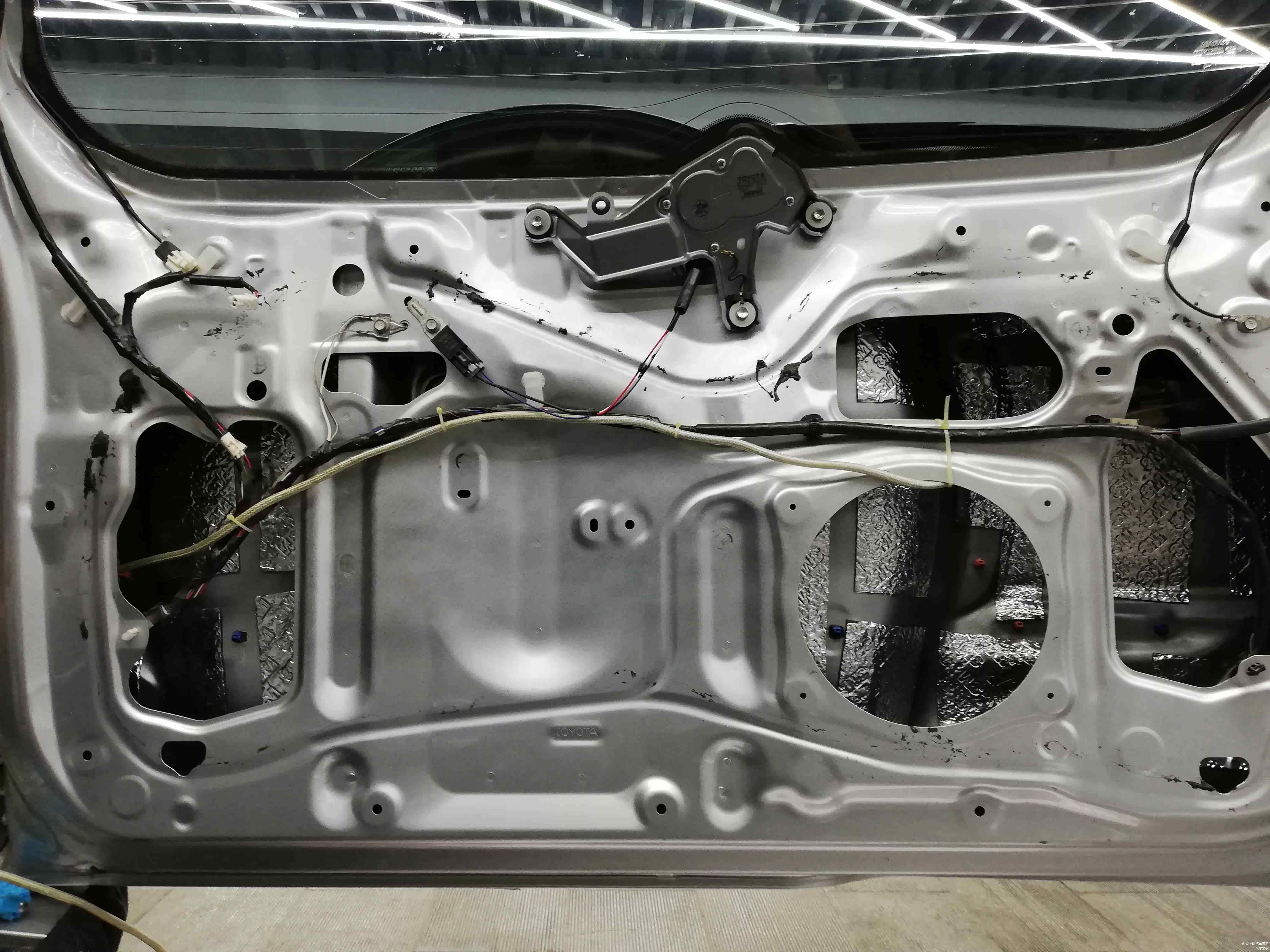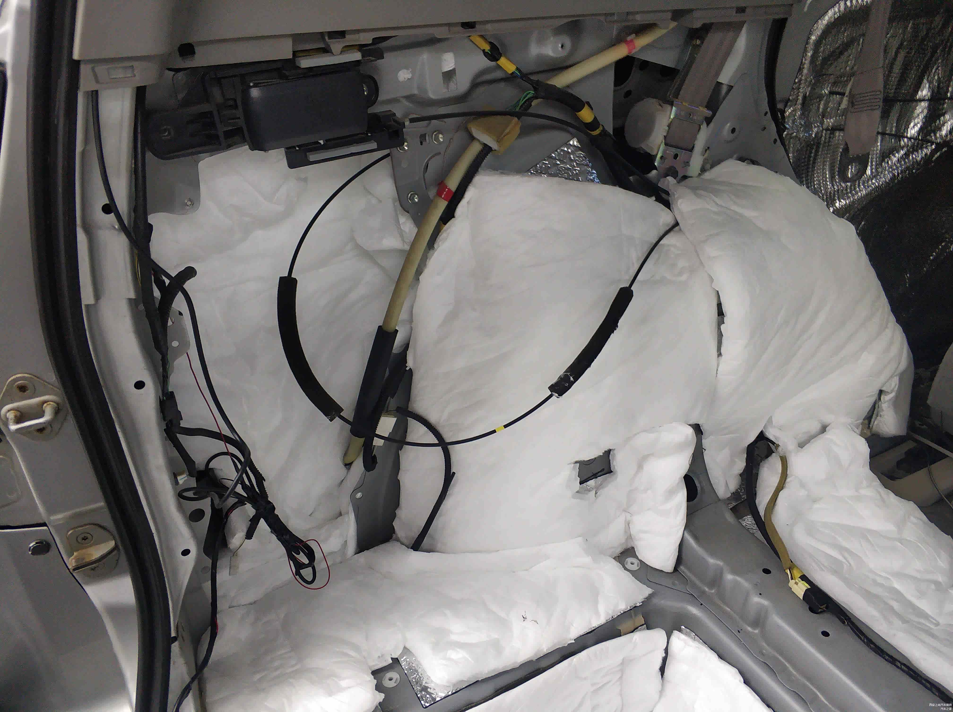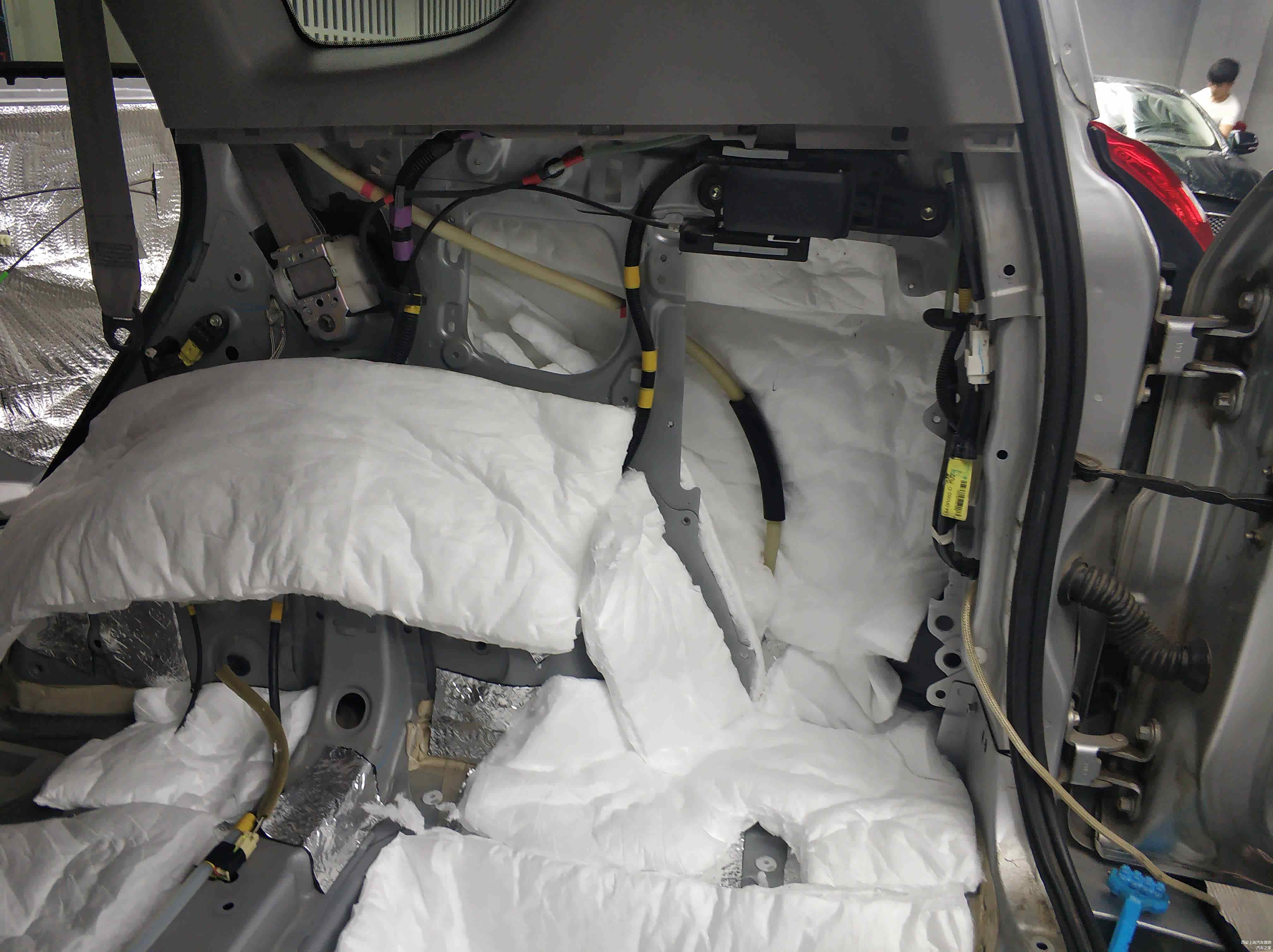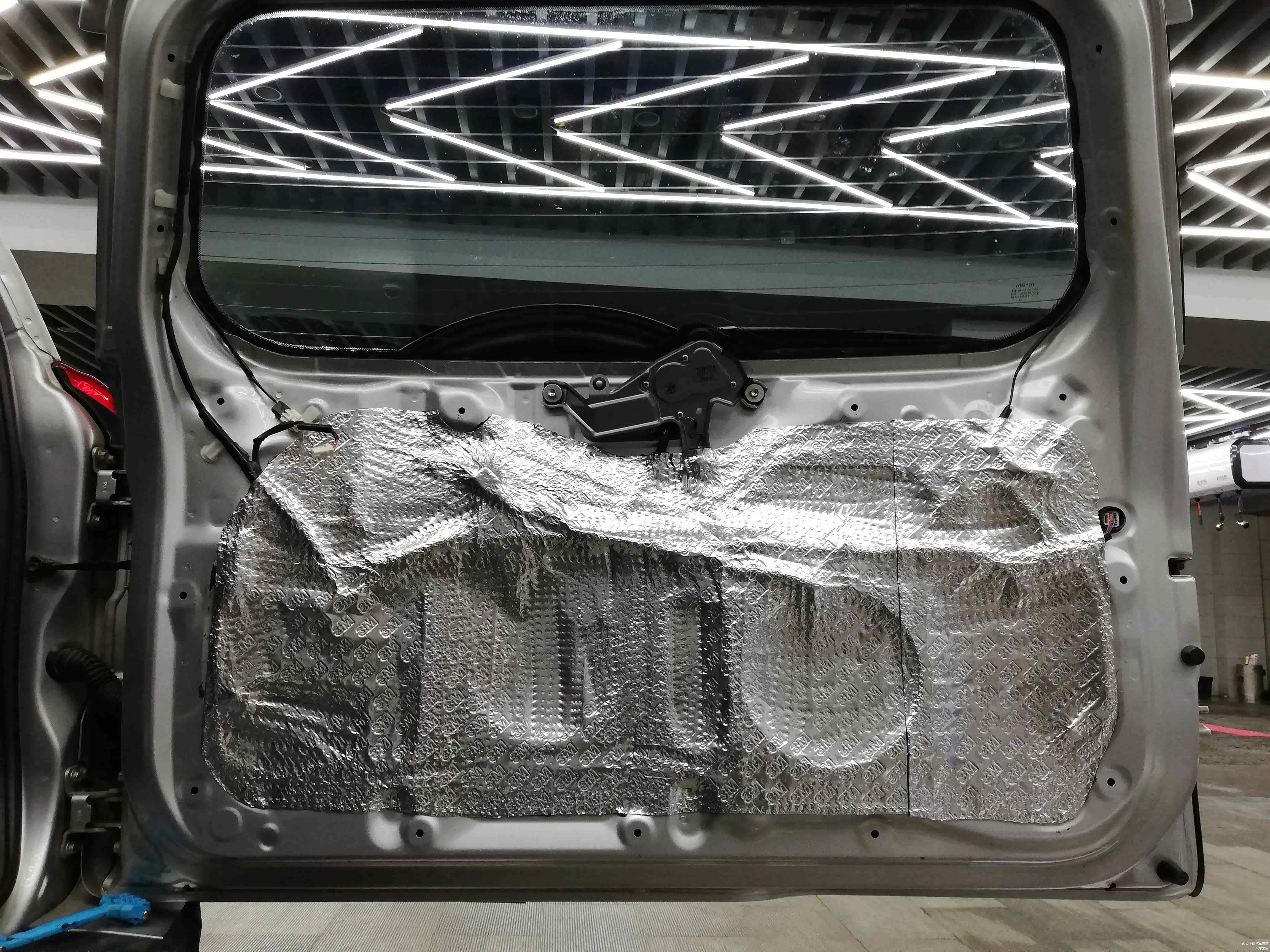 当然后尾盖的隔音也不能放过,将隔音材料裁剪成对应大小贴在后尾盖钣金上,有效抑制因为钣金薄弱而容易引起共振的弱点,跟门板隔音效果一样。