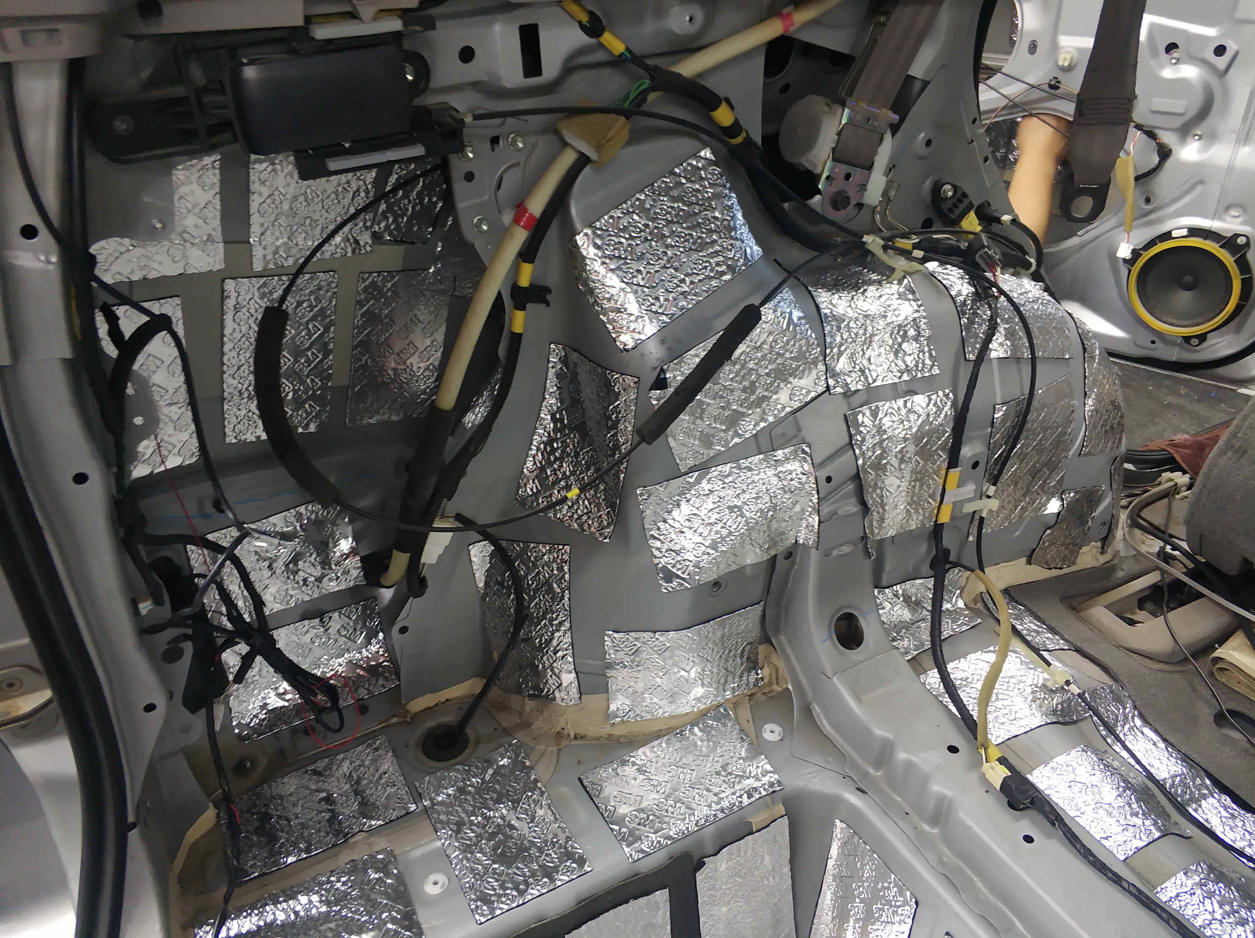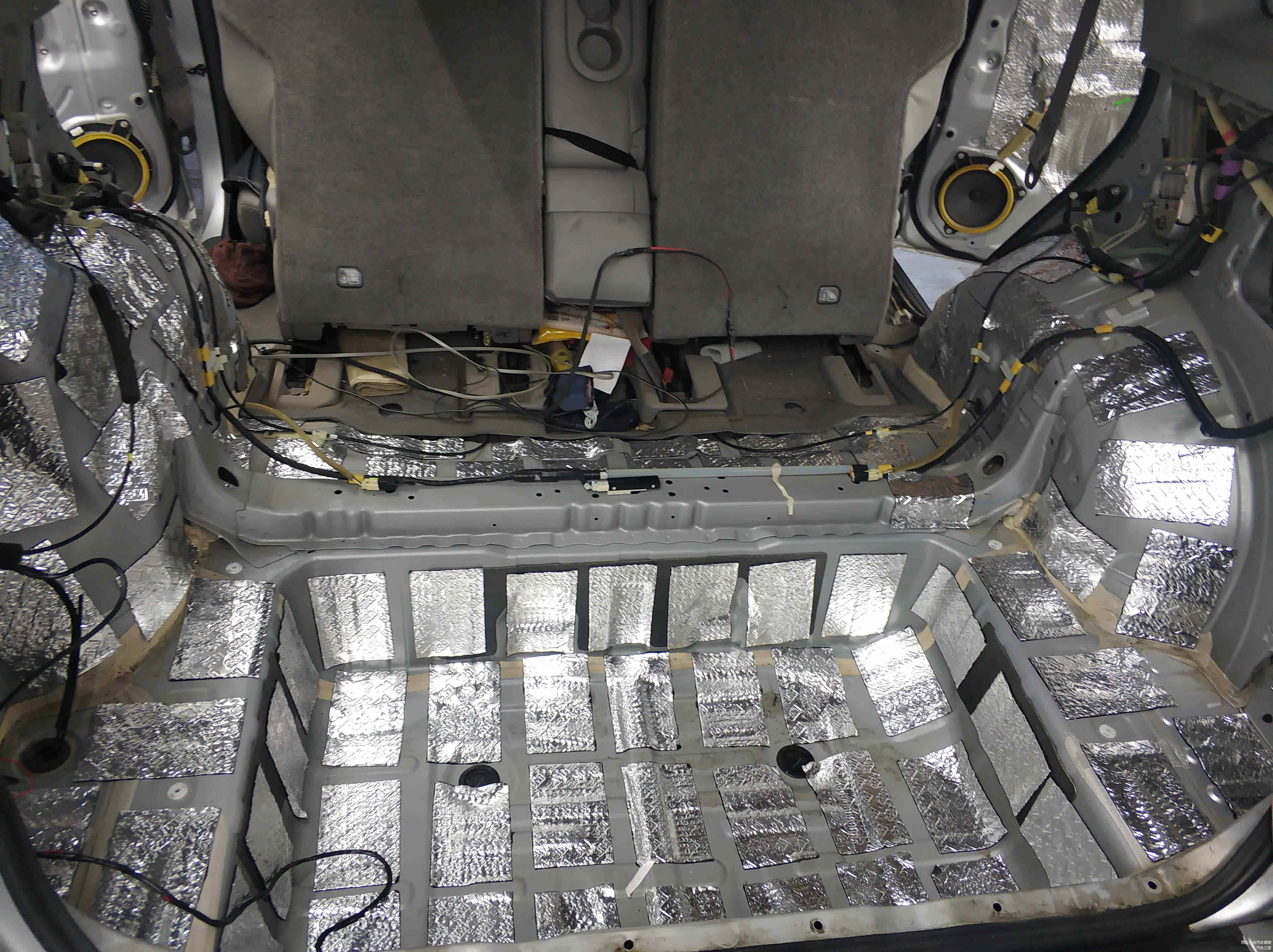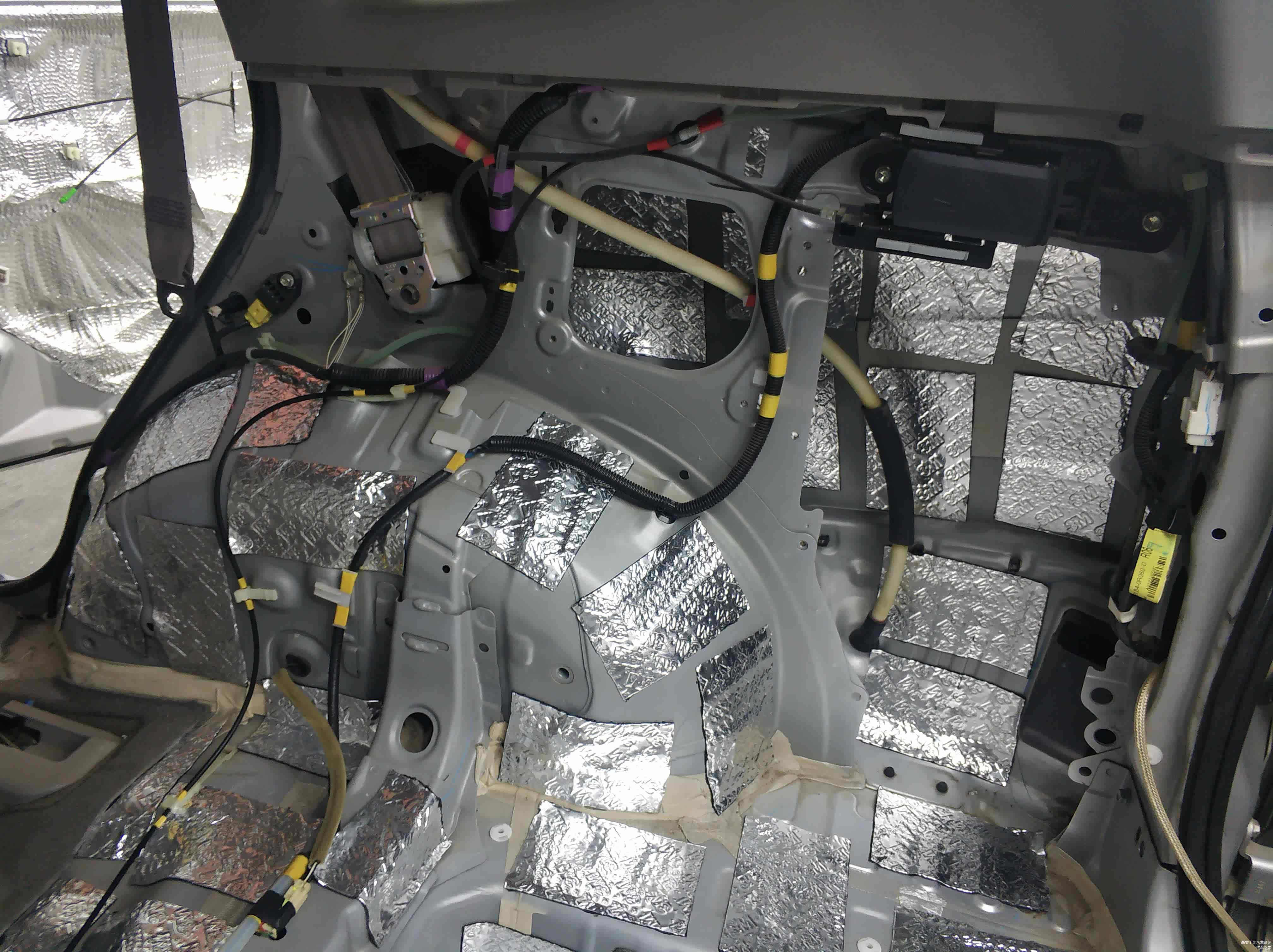 尾箱隔音第一层:西安上尚改装技师采用科学的手法,把隔音材料裁成一片一片的长方形状整齐规律的贴在尾箱上。