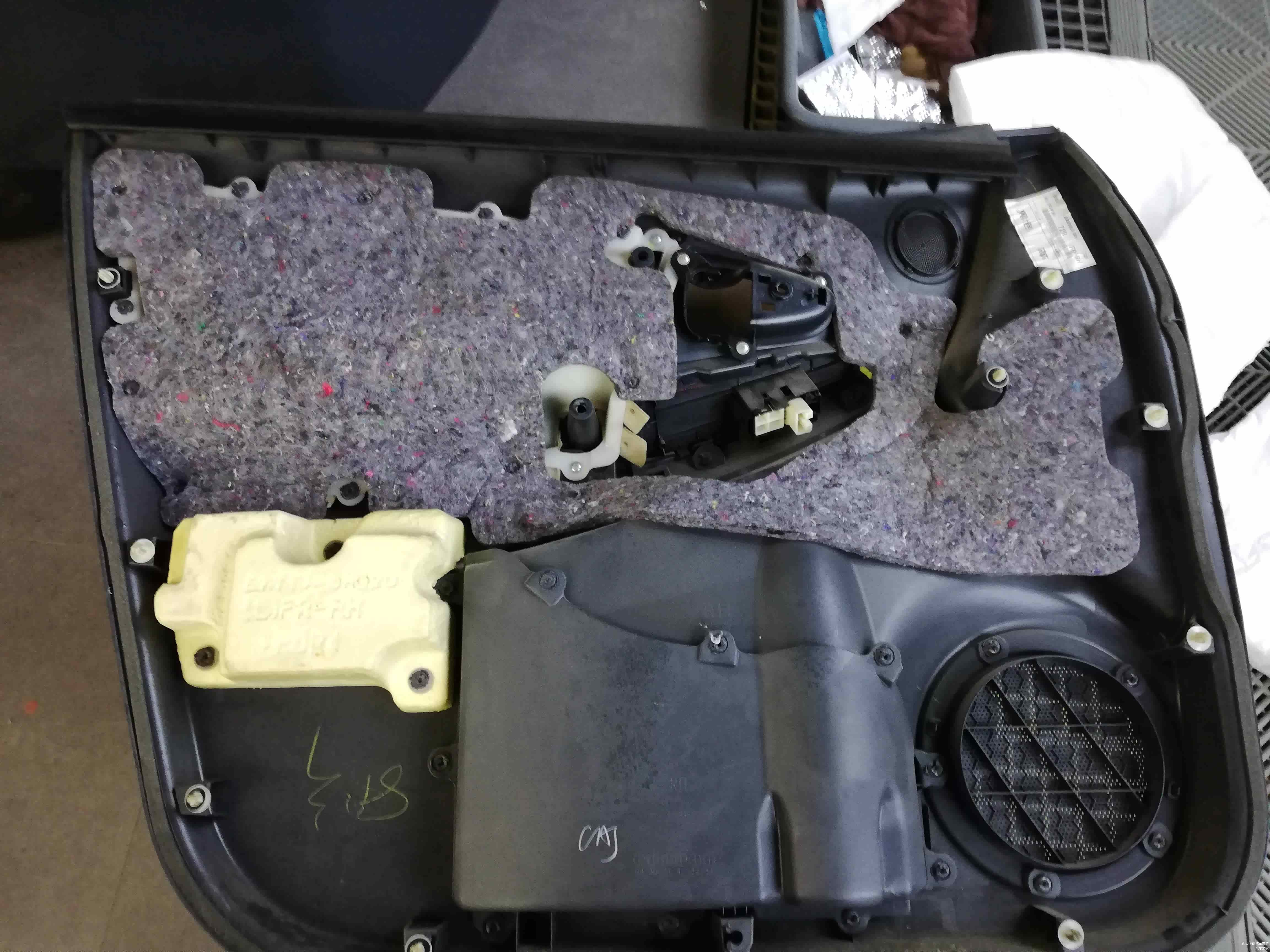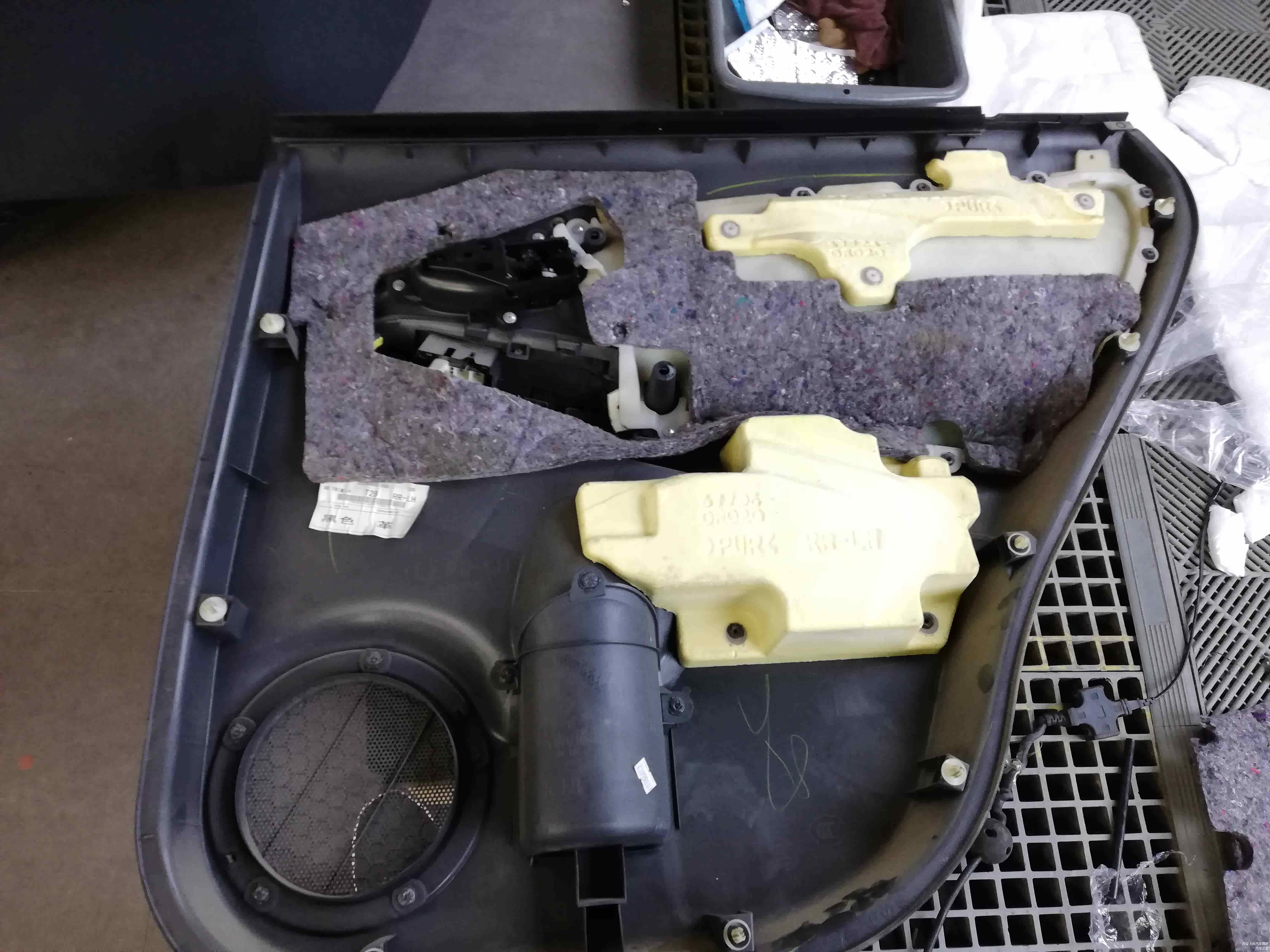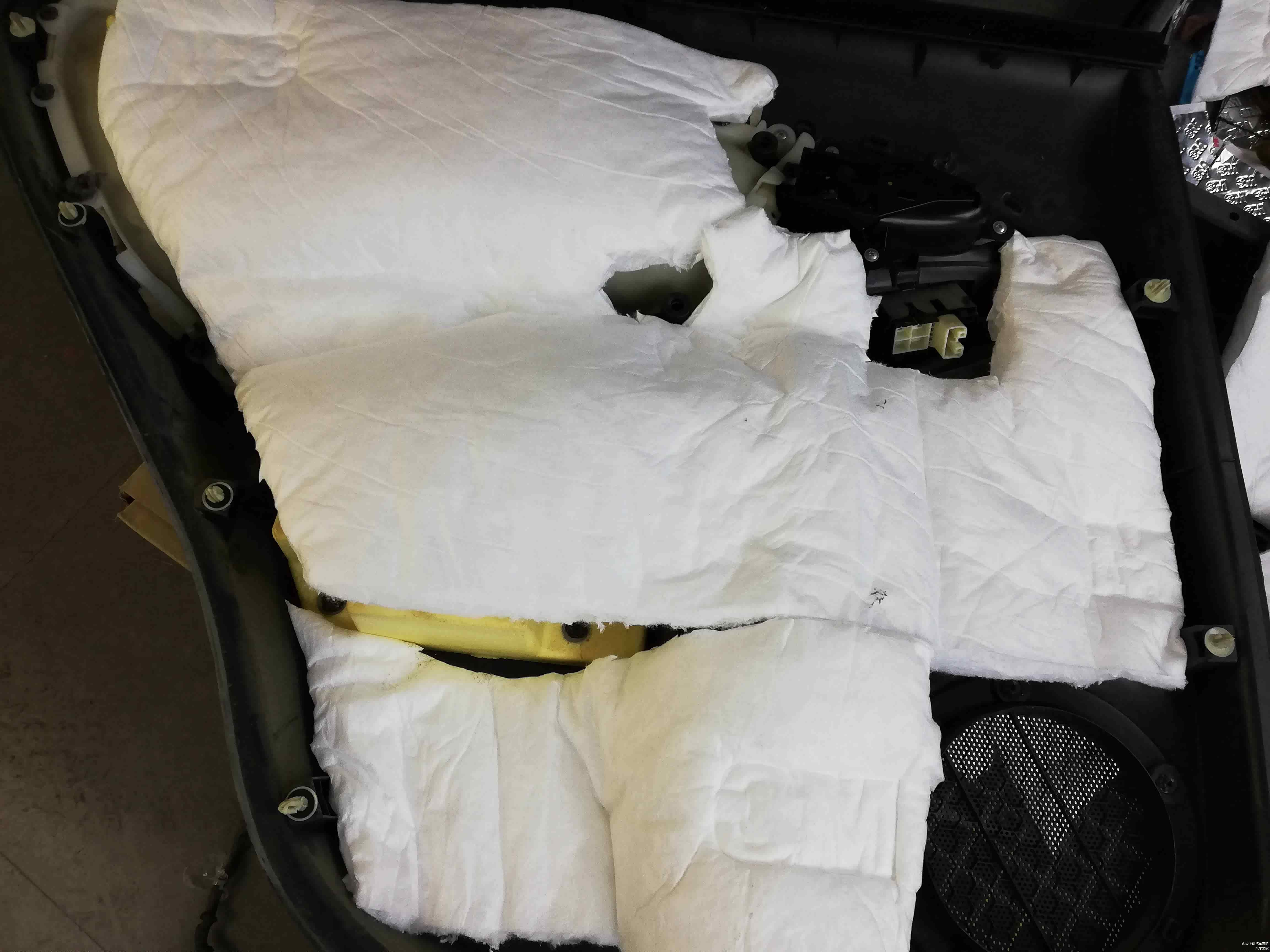 四门板拆开后可以看到原车门板的黑心棉,咱们经常在新闻上看到的车内有异味,散发有毒气体的新闻就是车内的内饰,不安全的隔音材料散发出来的。尤其在夏天停车后再开开车门的时候车内总是有一股难闻的气味,它对人身体有很大的危害。
