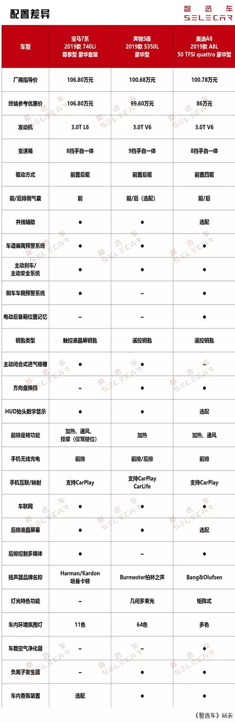 三款车型的指导售价较为接近,奔驰S级的优惠比较有限,奥迪A8则存在普遍10多万元的让利。就新款宝马7系的定价而言,是较为合理的。此外,考虑到宝马7系老款车型在市场终端的大幅让利,如果新款车型也能得以延续,其综合产品实力必将得到进一步提升。至此,小智认为新款宝马7系的市场表现相当可期。综合来看,奔驰S级还是更加偏向于庄重和严谨。注重运动操控性的宝马7系以及科技氛围感强烈的奥迪A8L则更加吸引年轻消费者的目光。