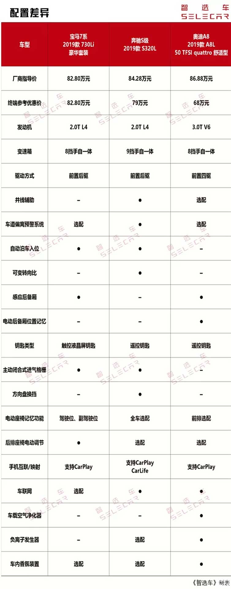 以2019款车型来看,宝马7系的指导价为82.80万-242.80万元,奔驰S级的指导价为84.28万-169.28万元,奥迪A8的指导价为86.88万-122.08万元。宝马7系刚上市,目前暂无优惠;而奔驰S级与奥迪A8L则有着不同幅度的终端让利。三车在指导价方面有着较大的重合,小智就选取85万元和100万元这两个价格段的车型进行对比,看看谁的性价比更高。