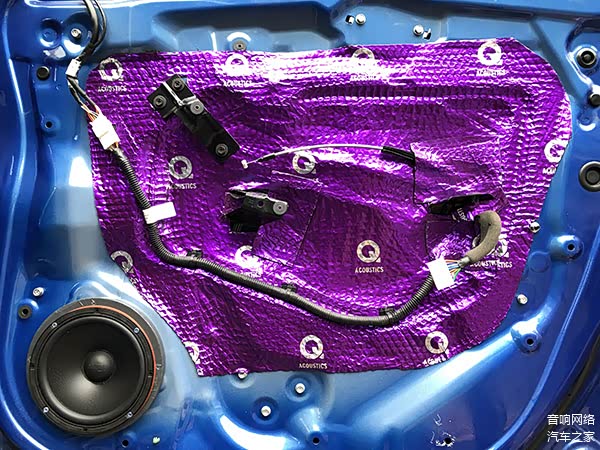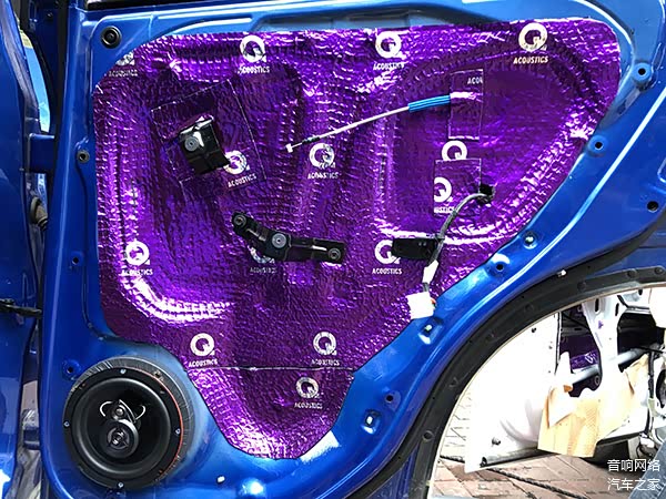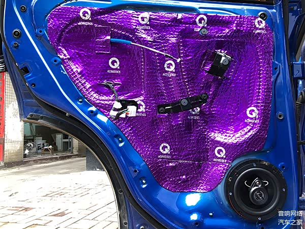 先在里层贴满Q牌隔音一层,抑制门板的共振,加强门板的刚性,外面一层整块贴上Q牌隔音,目的是使门板形成一个密封的箱体,不仅降低了风噪,最最要的一点是提升了音响的效果。
