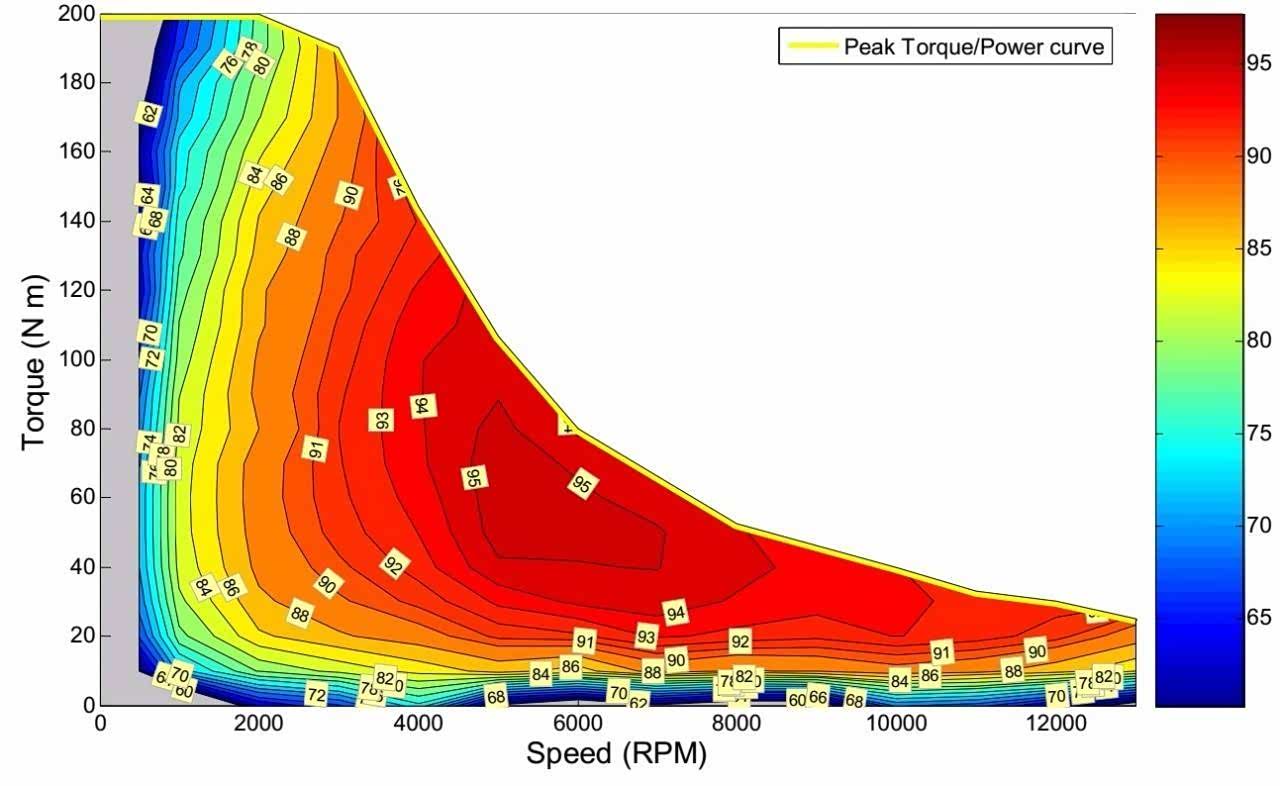 纯电车跑高速时,虽然能维持80%~90%电机效率,但风阻随着车速成平方数增加,车速越高纯电车需要克服的风阻就越大,所以高度电耗会比低速电耗高很多。下图是纯电车驱动电机的效率图。