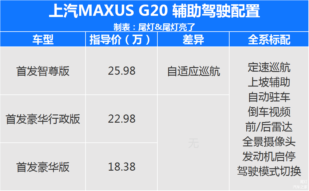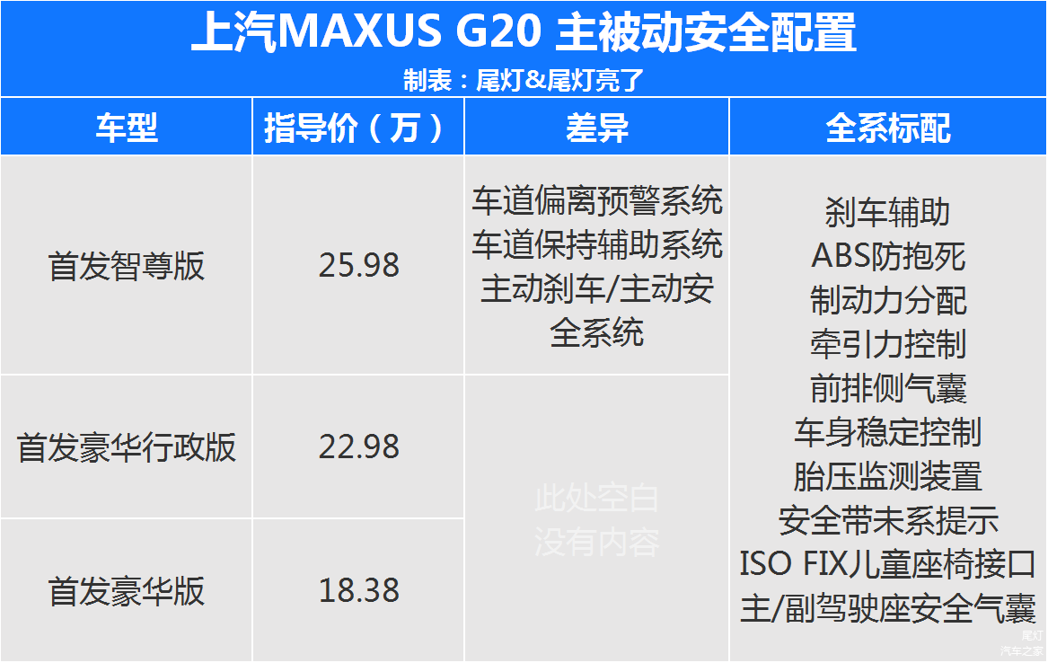 主被动安全的配置方面,G20顶配具有车道偏离预警、车道保持和主动刹车。如果在安全的配置一视同仁,在其他的配置上拉开差距是不是更好。