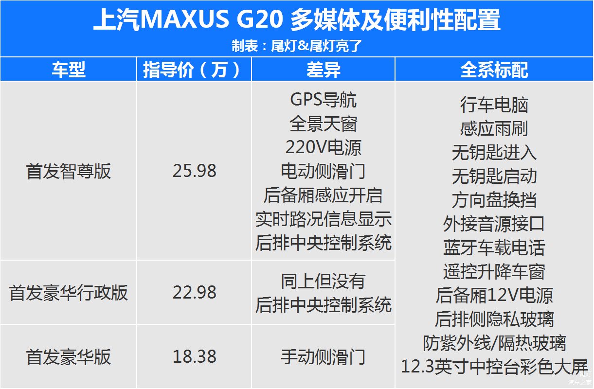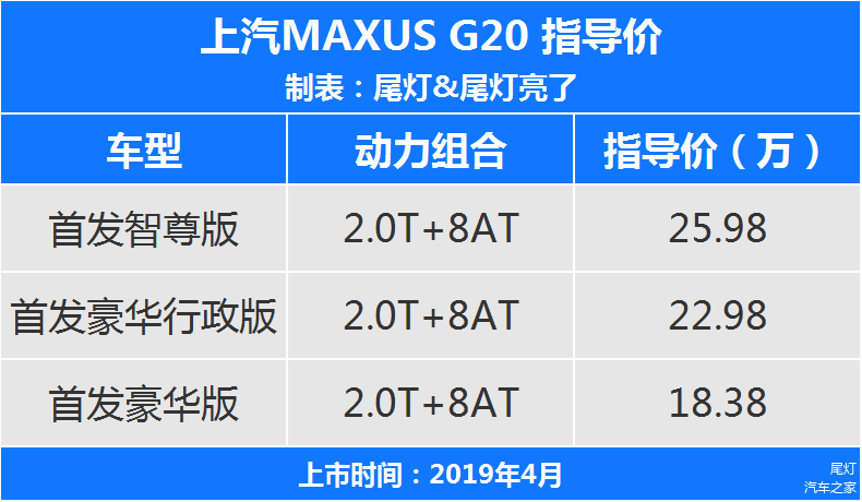 G20于今年4月上市,先期推出了三款车型,分别是首发智尊版、首发豪华行政版、首发豪华版,售价分别为25.98万、22.98万和18.38万。三款车型全部采用2.0T汽油动力,匹配ZF8AT变速箱。目前中国生产制造的MPV车型,还没有搭载ZF8AT的,大通G20是第一个也是唯一一个。