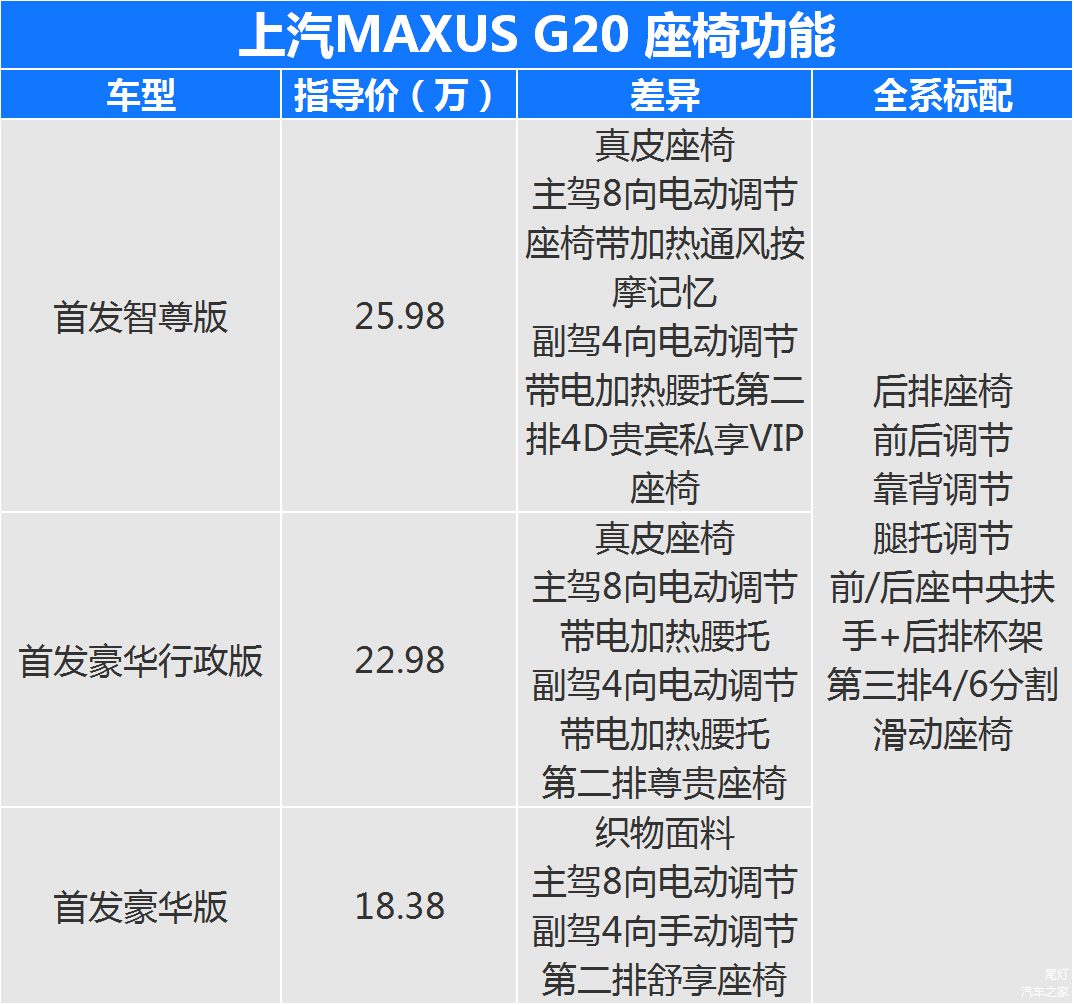 拉开主驾驶一侧车门,不难发现它的高,无论是车门的高度还是蹬车高度,都是开惯了小车需要适应的。“高高在上”的主驾驶坐垫几乎要和小编的大长腿齐平,目测调节功能不少,看起来也挺上档次。小编整理了大通G20座椅具备的一些功能,请看下图: