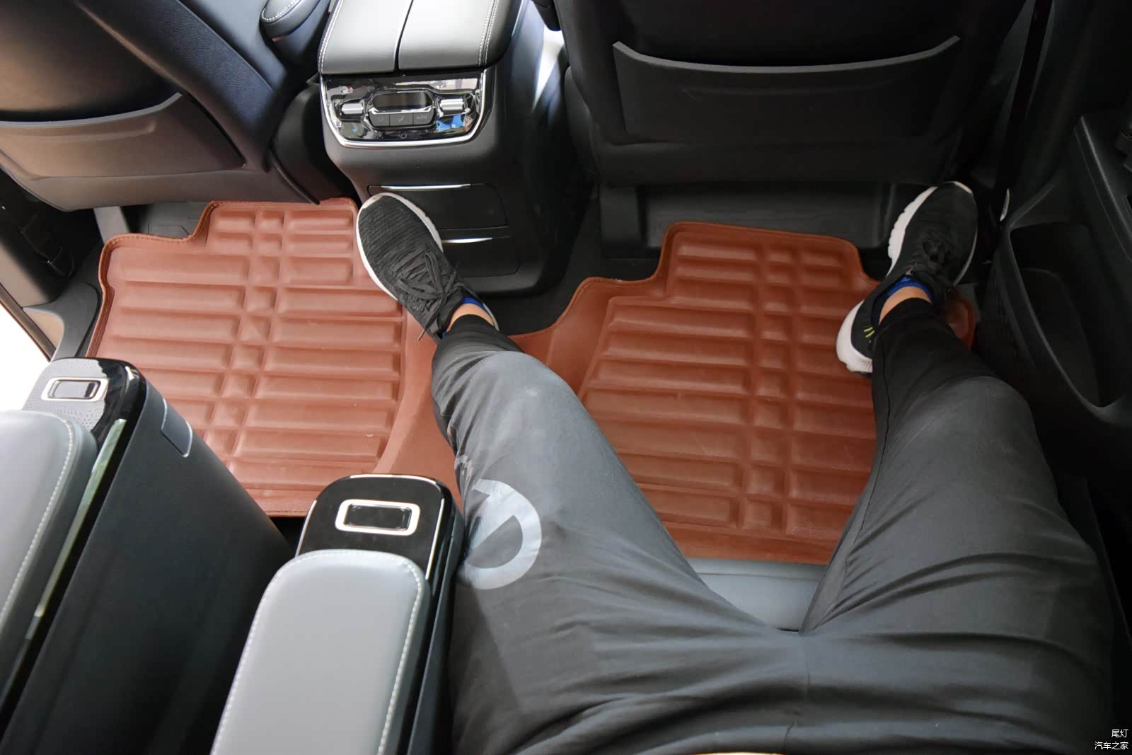 第二排的可以前后移动,这台展车二排座椅被销售调节到了比较靠后的位置,其实这样不好,感觉整个人都慵懒了。此时去第三排右侧,腿部空间还剩2指。