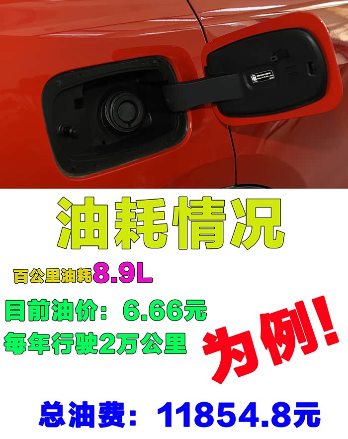 油耗方面,工信部给出的综合油耗为6.9L,为了更准确,一般实际油耗我们都会再增加1-2个油,因此我们就以8.9L为例吧,如果以目前油价每升6块6毛6(92号)和一年行驶2万公里计算得话,每年总油费大概为11854.8元,平均每月油费988元,日均油费33元,不知道这样的水平您还满意么?当然了这里我们只是举例供您参考,最终还要根据您的实际使用情况为准。
