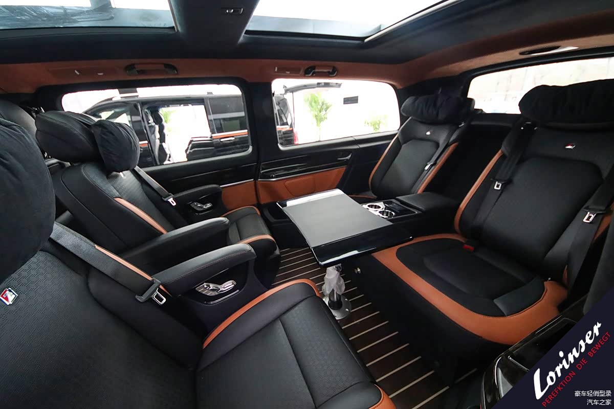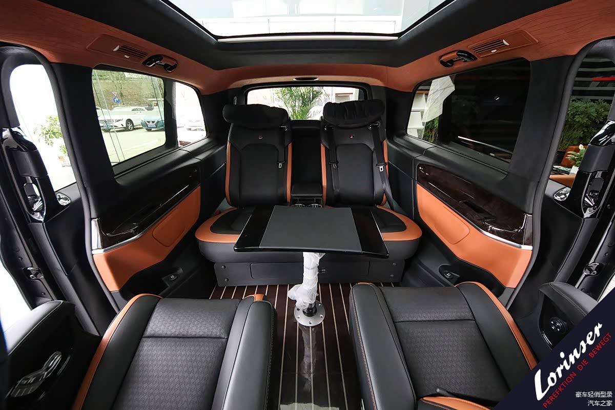 内饰方面罗伦士V260L 保留全系设计风格,黑色总体色调搭配橘黄色条纹双拼,时尚动感。地板采用简约风格的排线样式木质地板,内顶用大面积天窗一改车内视觉空间,相对原车来说更显精致舒适。