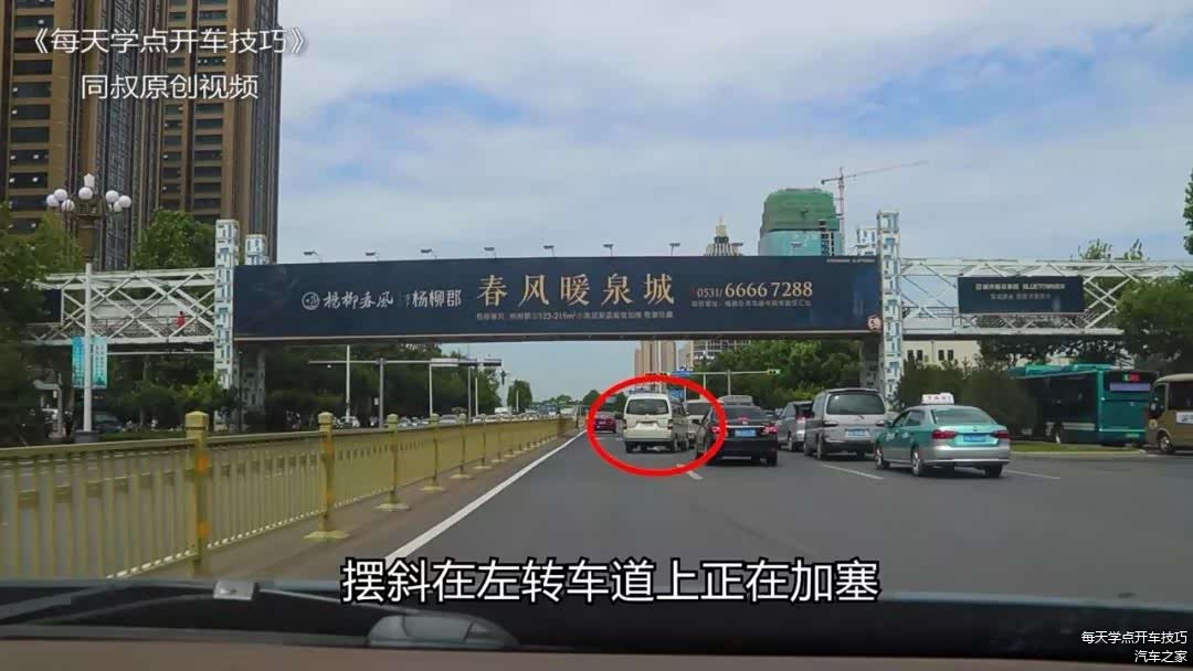 还有左侧车道这辆没有牌照的面包车,摆斜在左转车道上正在加塞。
