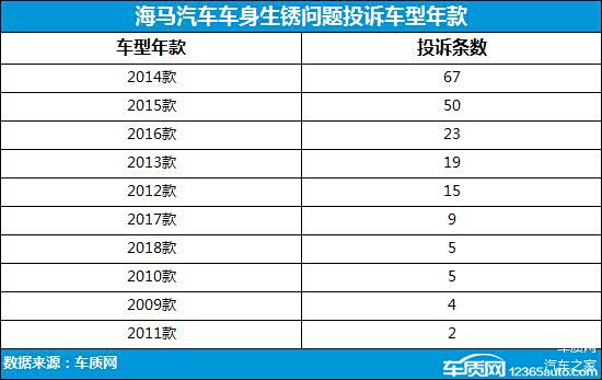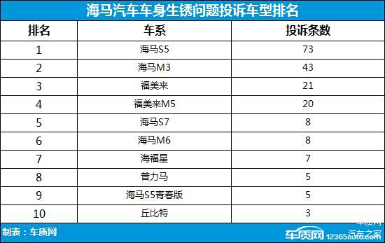 车质网投诉数据显示,截至2019年6月30日,共收到有关海马汽车车身生锈问题投诉202宗,涉及15款车型,几乎涵盖了全系产品。其中,海马S5问题最为严重,共收到73宗相关投诉,而海马M3、福美来以及福美来M5等车型问题同样相对集中。