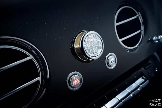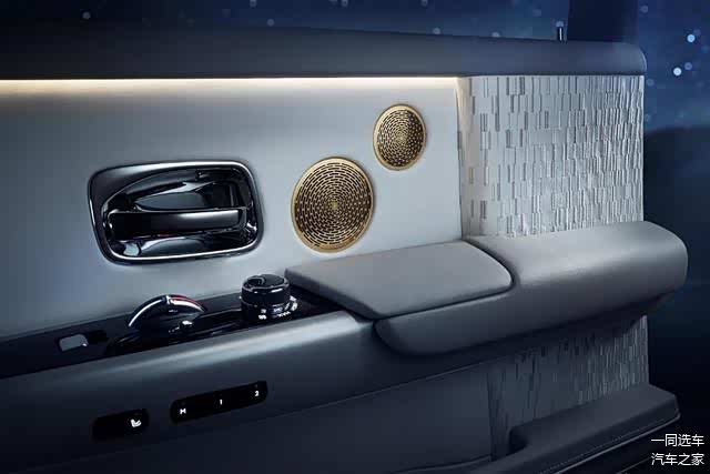 该车创作灵感来自地球之外的广阔世界。金黄色扬声器象征着“旅行者号”探测器带入太空的两张金色唱片;内饰真皮配色是受月亮表面明暗变化的启发;音量调节器上融入的流星元素,并以真实陨石为原料;加上钛金欢庆女神,与整体的星际主题相得益彰。