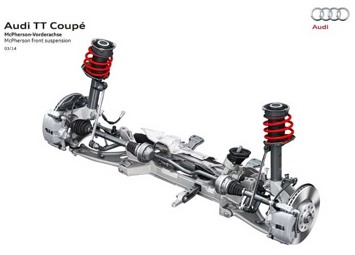 虽然 MQB-A平台的悬架和刹车系统可以做到共享,但奥迪TT和高尔夫的 前悬架材质用料也是明显不同的,奥迪 TT的前悬架副车架,下摆臂, 前悬架羊角均采用了铝合金材质打造,而普通版本的高尔夫乃至高尔夫 R都是没有这样的待遇的,前副车架,下摆臂 等组件均为钢制材料。