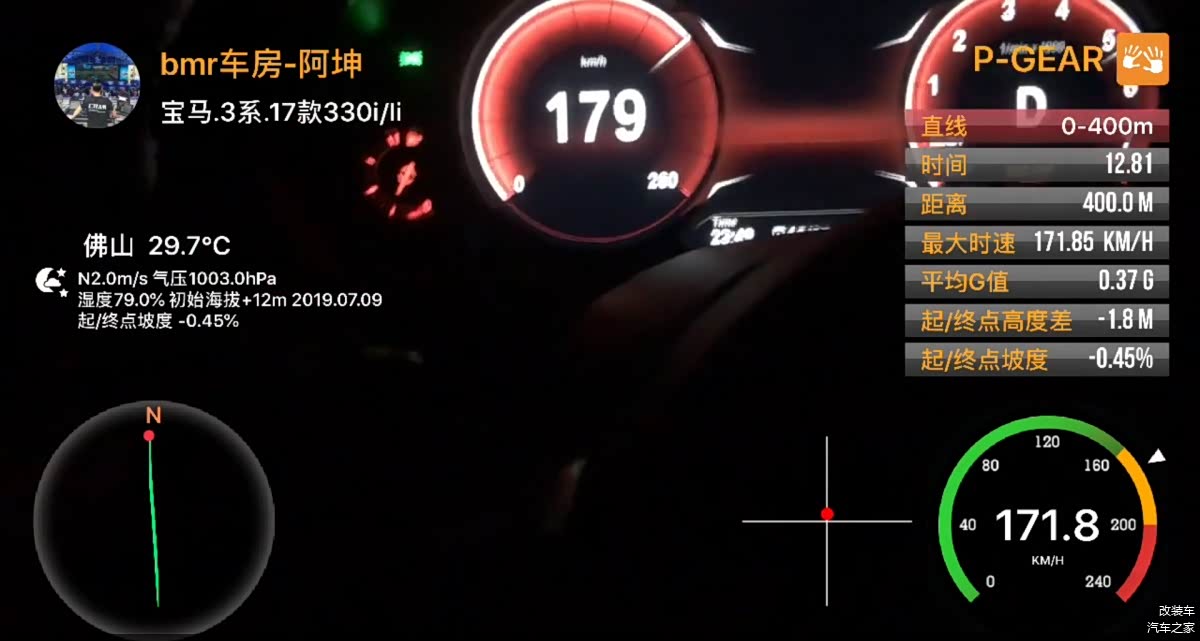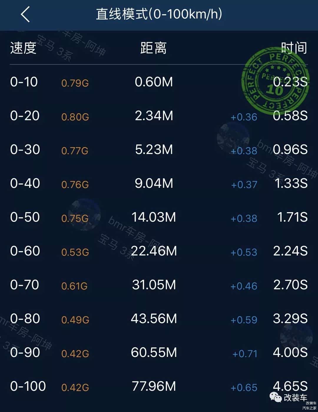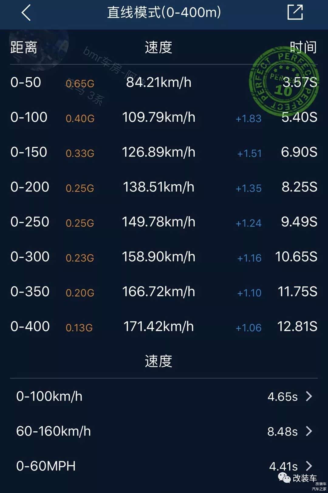 在测试前微调一下BMS数据,将涡轮压力调至22Psi(1.52Bar),0-100公里加速成绩跑出了4.65秒!而0-400米加速仅需要12.81秒!这估计是全国首台用原厂涡轮跑进12秒行列的2.0T宝马车型。