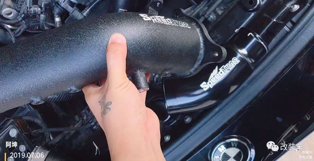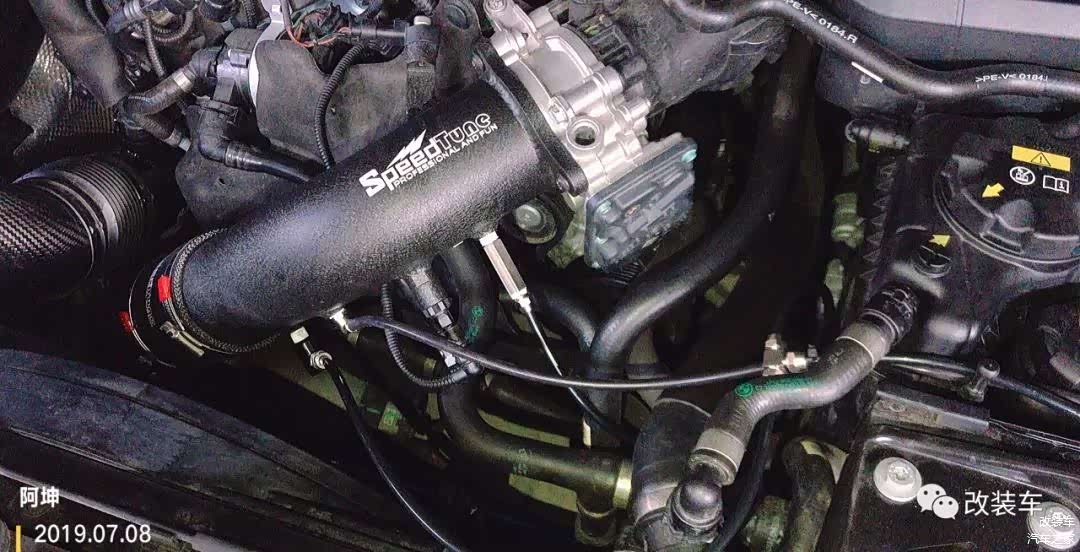 和车主一顿商量以后,更换了管径更合理的Speedtune铝合金涡轮管,此涡轮管预留了3个接口,可更从容地应对更高的改装需求,顺便更换上Speedtune的加大管径铝合金涡轮进气管,在同等压力下更有效提高涡轮工作的效率。