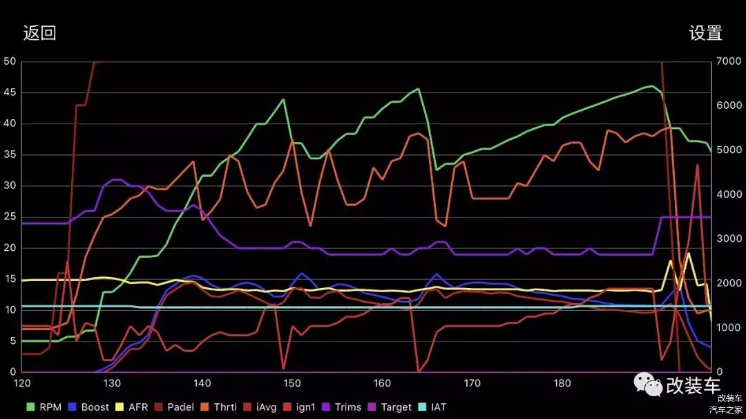 从6.17秒成绩中读取出来的log图综合来看,330i的出厂调教也极其保守,最高瞬压为15.5Psi、即1.05Bar左右,随着转速持续攀升同时,压力逐步下降,直至换挡时压力已下降至10Psi、即0.6Bar。而节气门开度一直保持着50%左右的开度(想快门),原厂换挡转数只为6200转,因为压力不高,所以点火效率也保持比较高的水准(压力与点火效率成反比)。