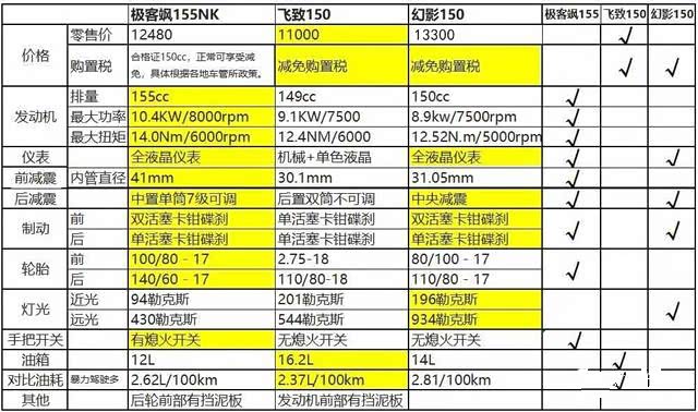 一番对比下来,三车的主要配置多少还是有些差距,极客飒与幻影150配置基本持平,而飞致150相比两车还是有些差距。极客飒相比幻影150优势主要在价格便宜820元,且动力更强。而极客飒155NK相对于飞致150,虽然价格也增加了一千多元,但多花这一千多元配置可以升级这么多,还是非常划算的。