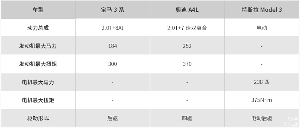 对比三款车的数据,宝马3系和特斯拉Model 3是后驱,奥迪A4L为四驱,这是不是就代表A4L的操控一定好呢?另外,A4L匹配的双离合变速箱表现如何,会不会出现顿挫的情况呢?接下来一一揭晓。