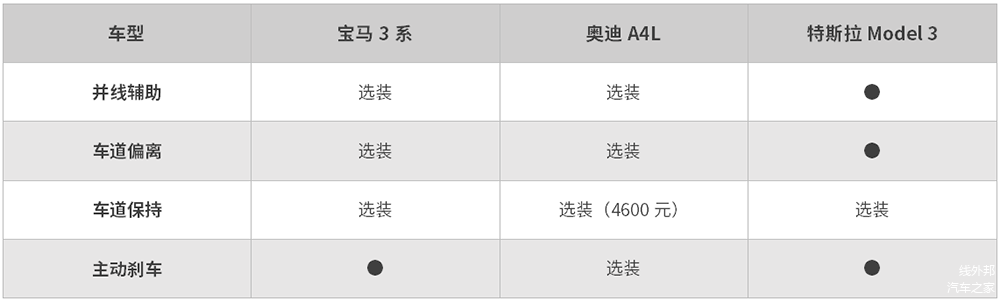 安全性配置方面,从下表来看,特斯拉Model 3的优势明显(不过要说明的是,我拿到的试驾车型基本上是满配车型,也就是说,即使配置单上显示为选装,试驾车也会配备。所以消费者在试驾体验时一定要注意其中区别)。